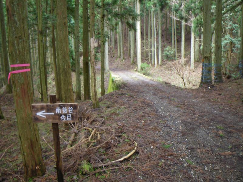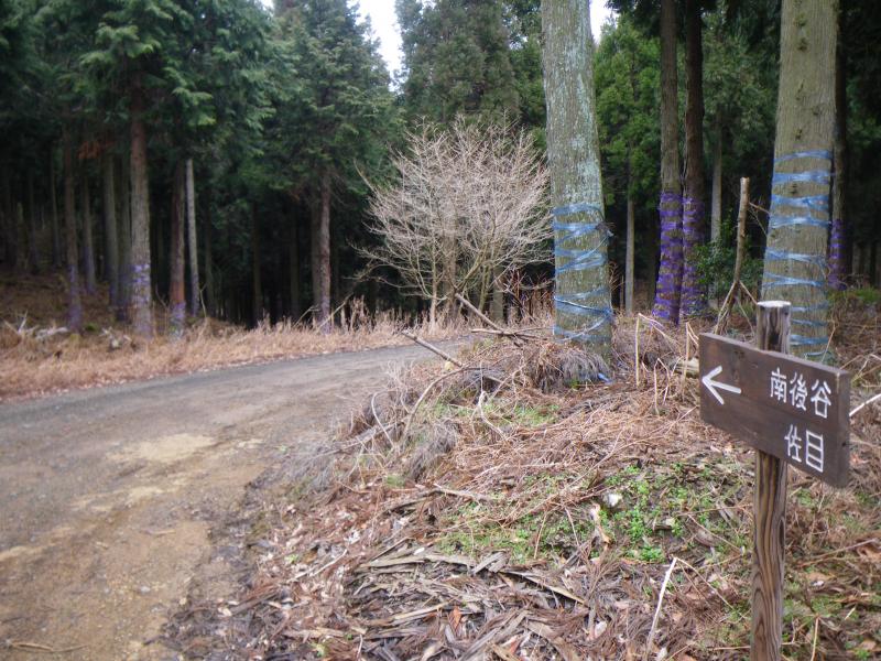 ⑧先程の人十二相神社からのコース合流点からすぐに林道が分岐しますが、標識通り南後谷方向へ右折します。ちなみに逆に行くと丸山に行けます。