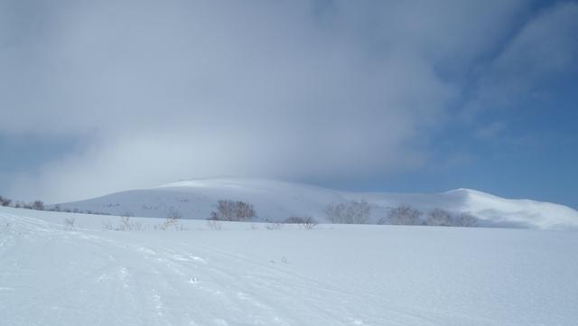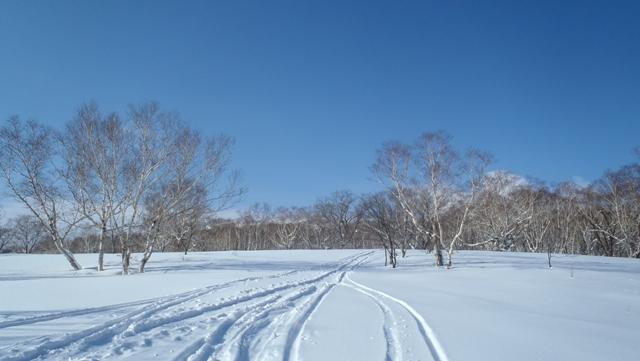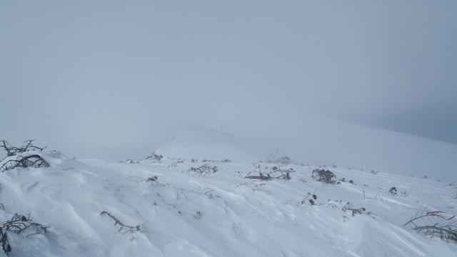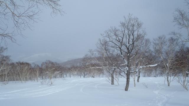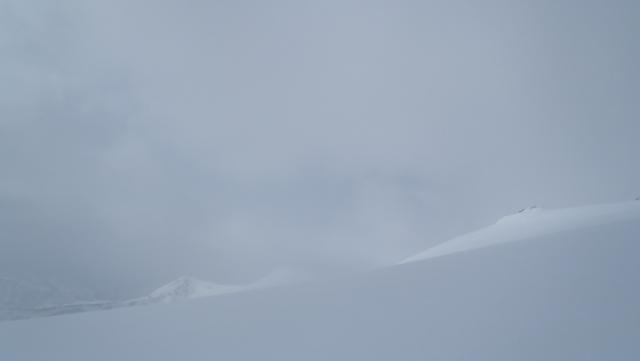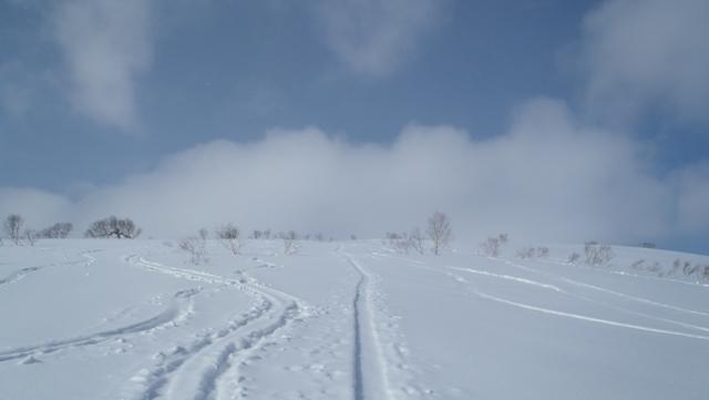 風が強くなる中、誰もいない頂上へ。視界も悪く、余別岳はまたの機会としました。お楽しみの下りは一気に休憩所まで!広く気持ちの良い斜面をあっという間に滑り降りました。これからしばらくはこのエリアは春スキーが楽しめそうです。