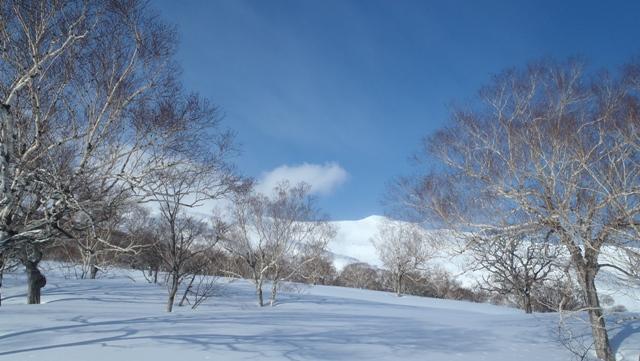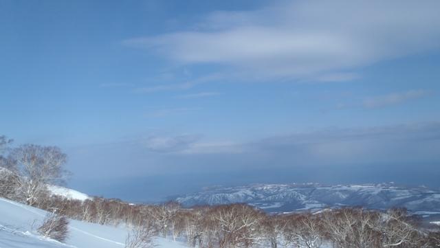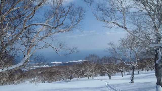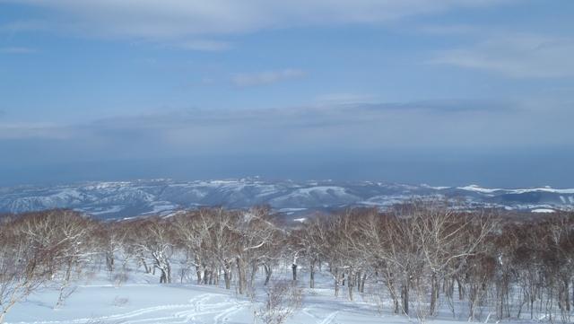 海を見ながら滑りたいと、沢シーズン以来となる積丹岳へと入山。除雪最終地点から休憩所までちょっと急な林道をたどるとそのまま疎林帯へ。なだらかな斜面を登っていくと、やがて森林限界へ。振り返ると、日本海。残念ながら曇で積丹ブルーとは言えずも満足。