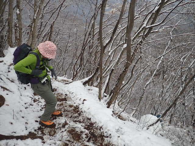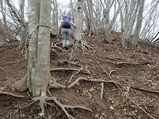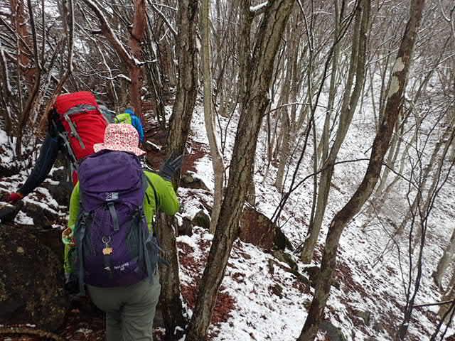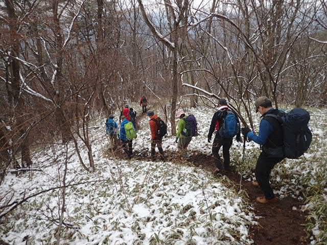 数日前に降った雪がまだまだ残っており、溶けて雨みたく降り注ぐ中、お客様に交代で先頭に立ってもらい、ナビゲーションをして頂きました!「こう出てくる道をこう行って、その際にどこそこから尾根が~」と発表してからのナビ!普段はなかなかしないことで、緊張感を楽しんでいただけました。個人的にも逆ルートでした行ったことのない場所なので、季節が違うこともあって読み応えがある山でした。