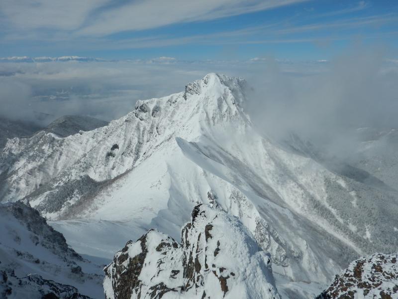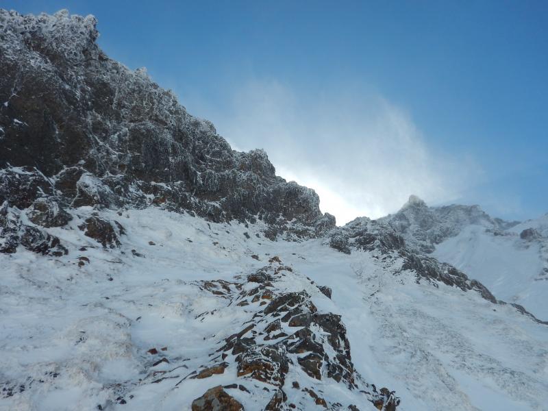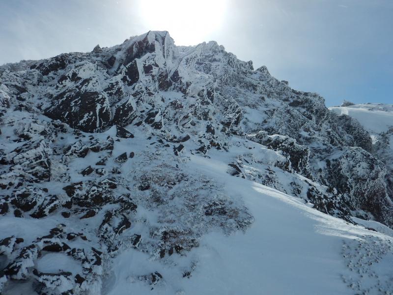 緩傾斜の草付きは雪が少なく凍結している個所も結構あったのでアックスとアイゼンをしっかり効かせながら登った。