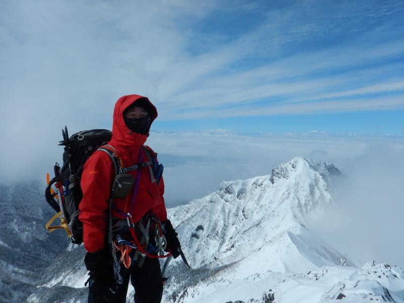 - 先日降り積もった雪のおかげで、トレースのない手つかずの赤岳主稜を楽しむことができた。初めてのルートということもあってルートファインディングに迷ったところもあったが、素直なラインを登りつめていけば自然と赤岳北峰にたどり着いた。