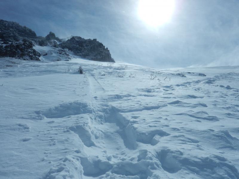 文三郎道から主稜取り付きのチョックストーン(CS)までのトラバースは膝から腿ぐらいまでのラッセル。取り付きのペツルはギリギリ出ていた。