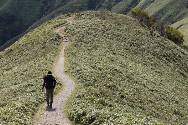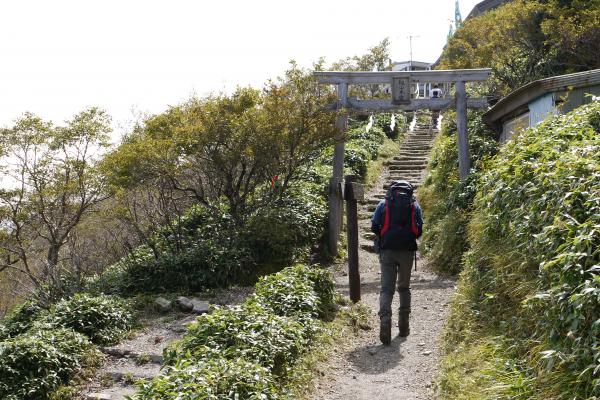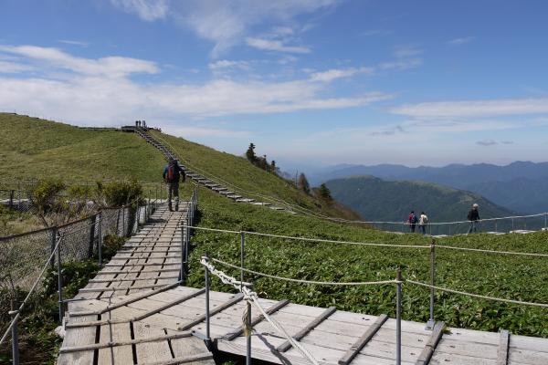山頂は広く、クマザサなどを保護するために木道が敷かれています。