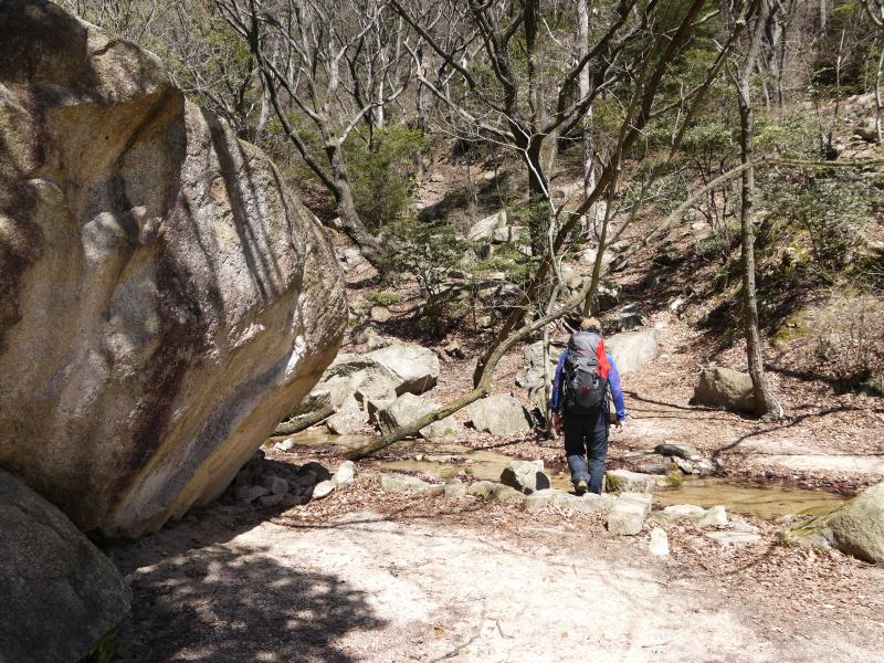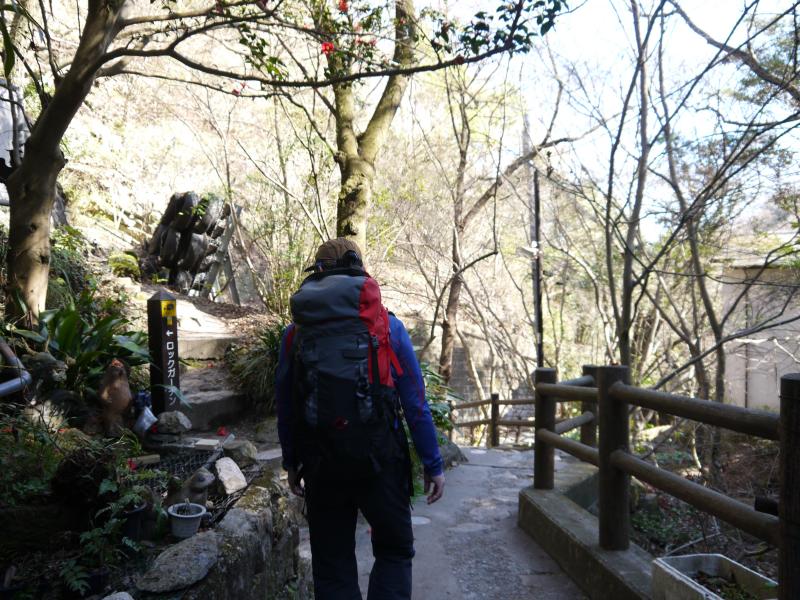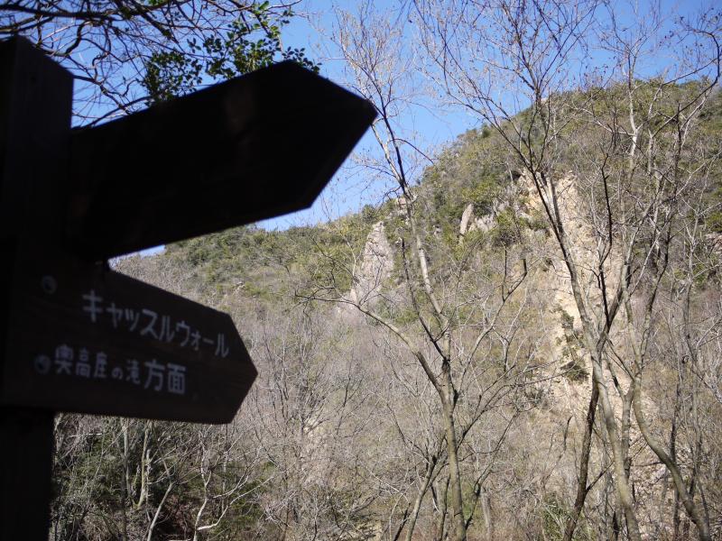 - ・高座の滝からキャッスルウォール:何度か高座川を渡りながら上ってゆきます。イノシシが住みついていることで有名ですがこの日は見かけず。キャッスルウォールを見上げて左手の急勾配の岩場を登りますが足場はしっかりしています。