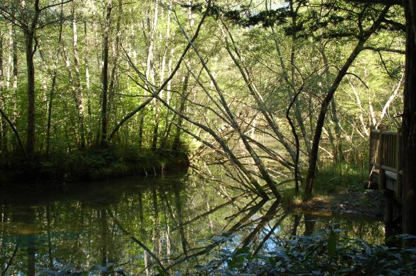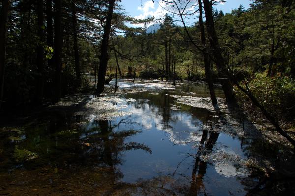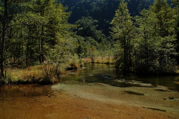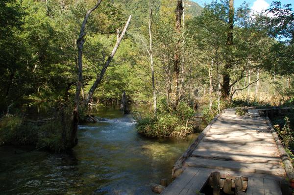 河童橋から明神橋へ、静かな森の中の自然探勝路を歩きながら、渓の中に岩魚を探したり