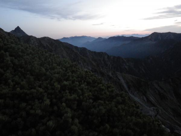 2日目:南岳小屋==(5分)==南岳山頂==(105分)==中岳==(40分)==大喰岳==(20分)==飛騨乗越(10分)==槍ヶ岳山荘==(30分)山頂==(310分)==横尾山荘