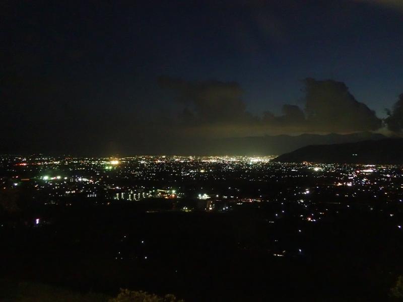 汗を流してさっぱりして、ゆっくり食事を楽しんでいると、だんだん街の光が灯り素敵な夜景が広がりました。大月駅に戻るとプラットホームの桜がライトアップされていて、電車が来るまでゆっくりと夜桜を堪能できました。