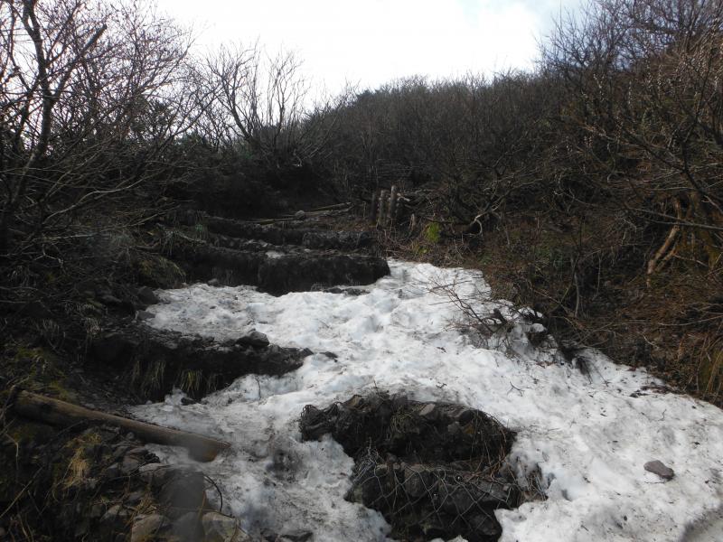 今年の大山はいつもよりかなり雪が少なく、例年なら4月の大山登山では最低限軽アイゼンは必携ですが、今日の残雪の状況ではアイゼンは使いませんでした(8合目手前の10mほどの残雪はやや急な斜面に残っているので、雪に慣れていない方は念のため軽アイゼンがあれば安心です)。
