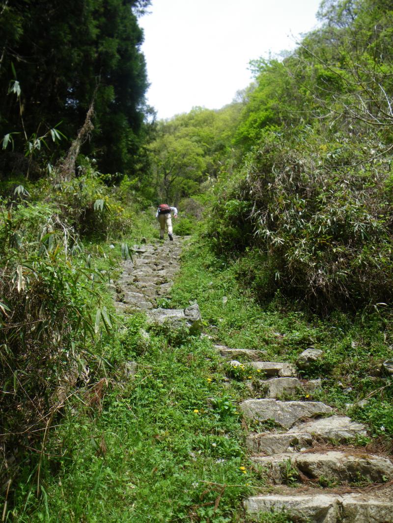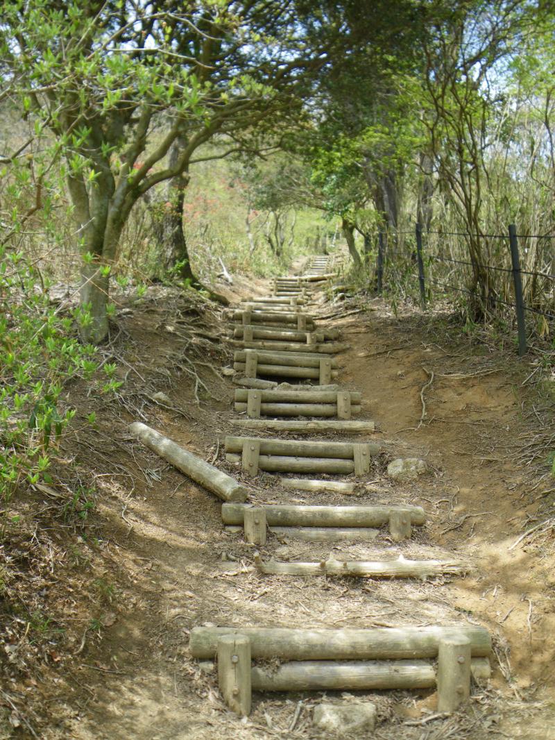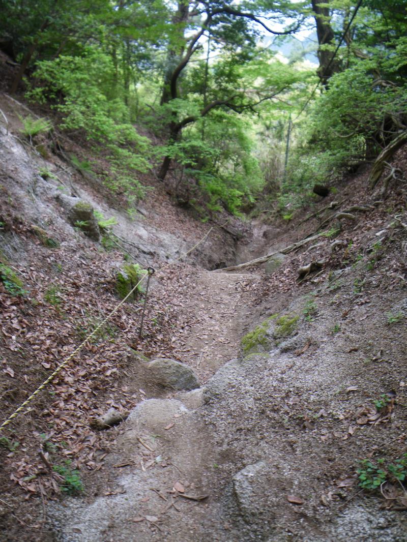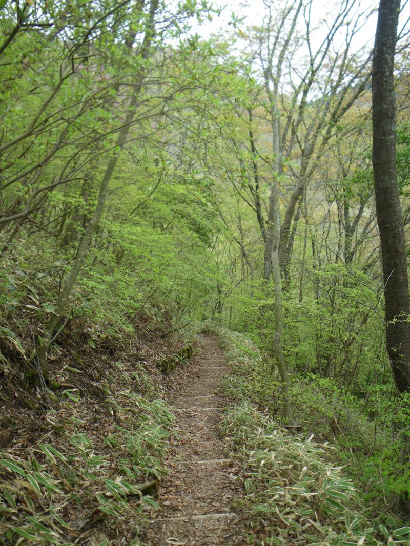 奈良側は葛城山ロープウェイが走り、手軽に山頂が踏める為に家族連れでも安心で、主に奈良側から登られる方が多いですが、今日も平日にも関わらずたくさんの人がいて、金剛山にも負けていません。葛城山ロープウェイで下りたくなりますが、バスの時間がまだありそうなので、自然研究路経由北尾根から下山しました。自然研究路~北尾根出合までは新緑がまぶしく、いい散策道という感じですが、北尾根の下部は鈴鹿のように登山道がえぐれた溝のような登山道が続き、歩きにくい箇所がありますのでスリップ注意です。今日歩いてきた水越峠からの階段道よりはいい感じです。