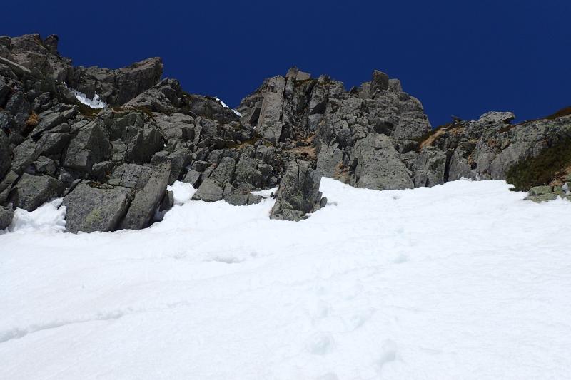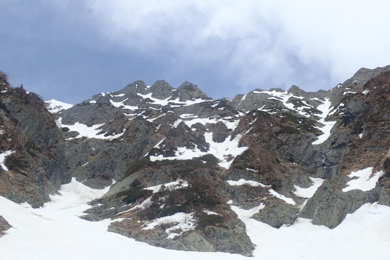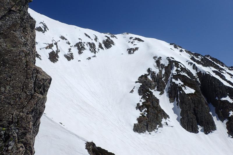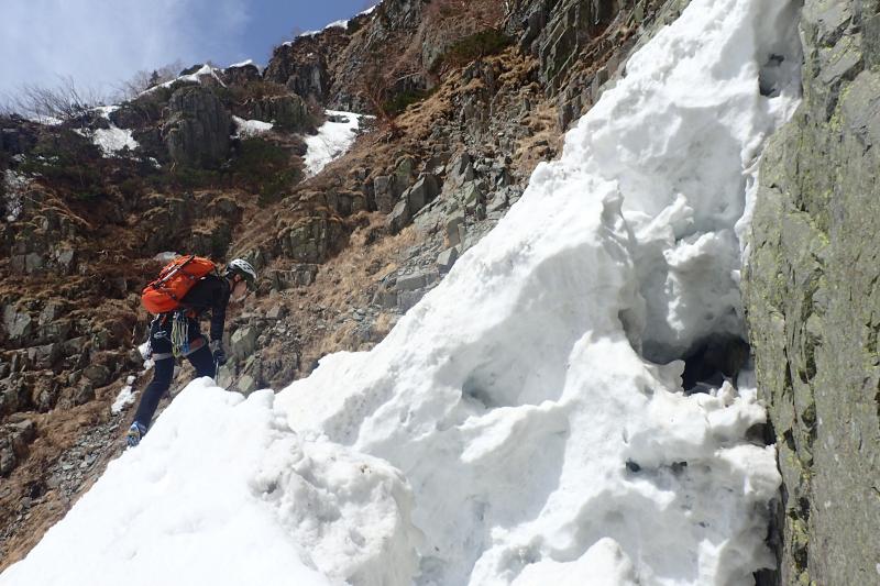 南稜を偵察した感じだ例年と比べ1ヶ月くらい早い雪解けで、シュルンドがあちこちで大きく口をあけていました。