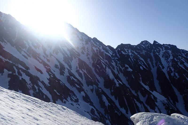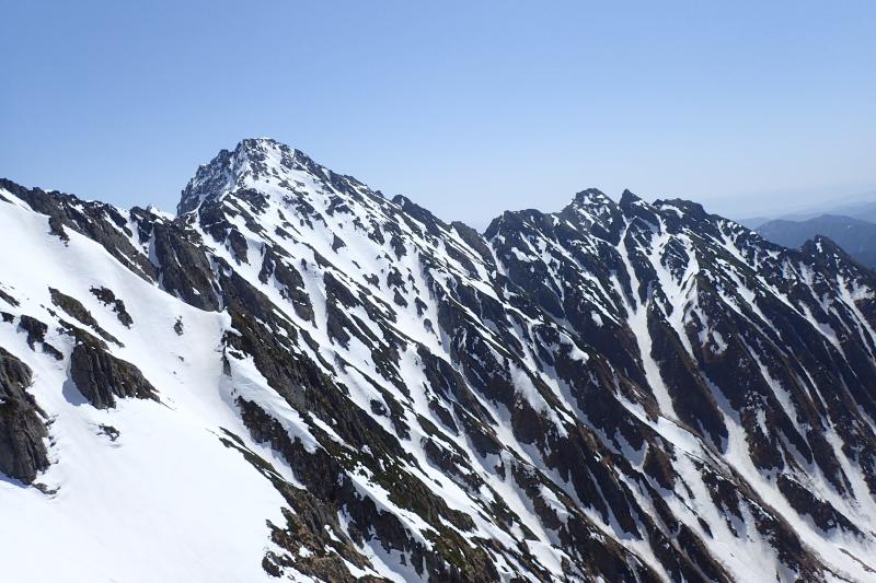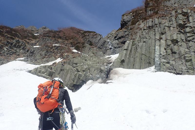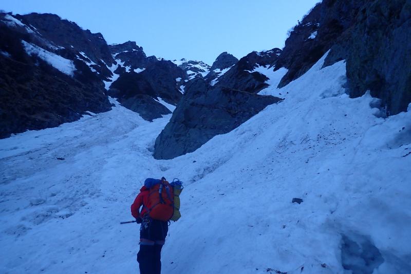 翌日は、テントを撤収をして4時前に出発するも、登るにつれ傾斜が増すコブ沢はペースが上がらず。マイナーピークではロープがスタックしてしまい、登り返しで時間がかかってしまいました。