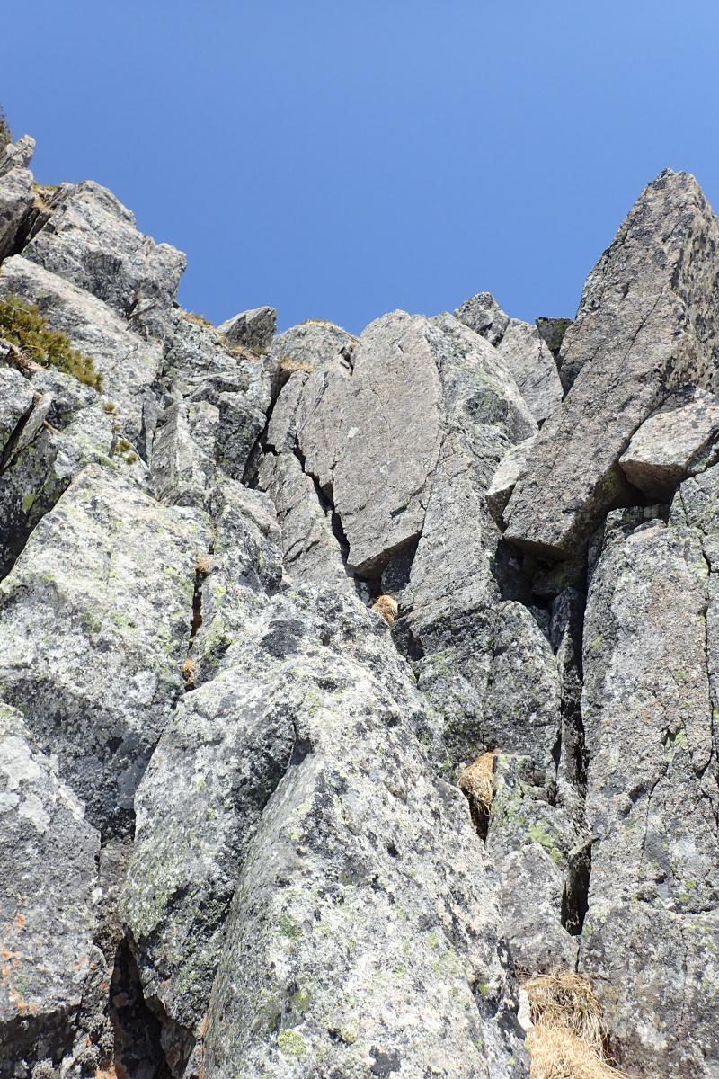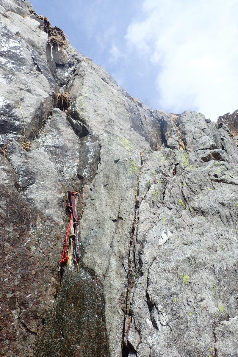 ここでいくつかルートがある(正面、左、右)みたいで、私たちは正面から登りました。1ピッチ目は凹角からの快適な登りでしたが、ザックがひっかかり手こずる場面も…。1ピッチ目の後半にややうす被りの1枚岩を超すのに難儀してしまいました。背伸びをして上のガバは持てるんですが、フットホールドが細かくなかなか足が上がらずで何度もトライしてなんとか1ピッチ目を登れました。