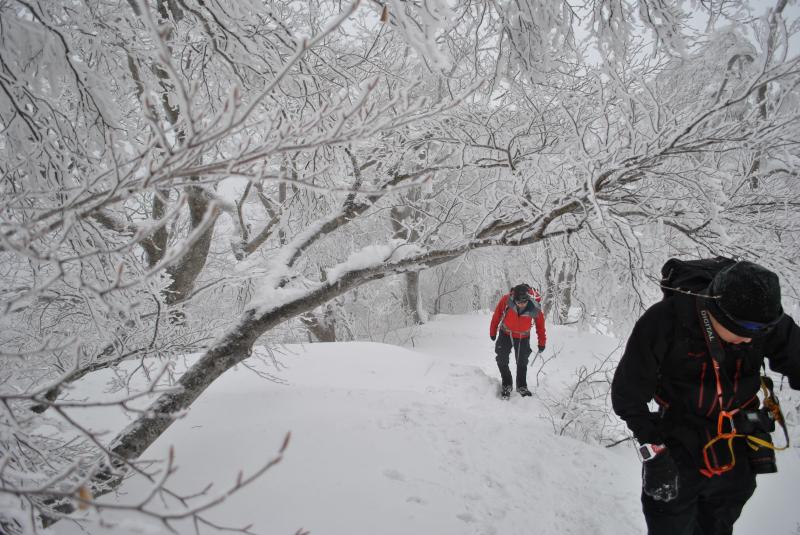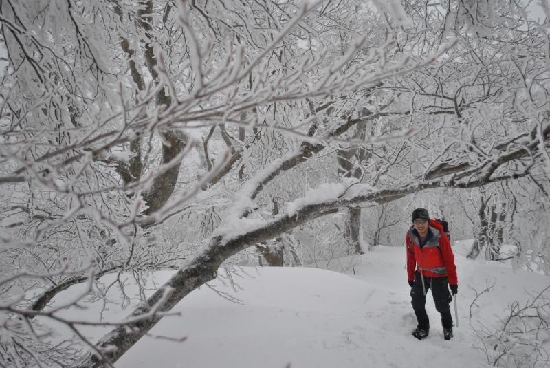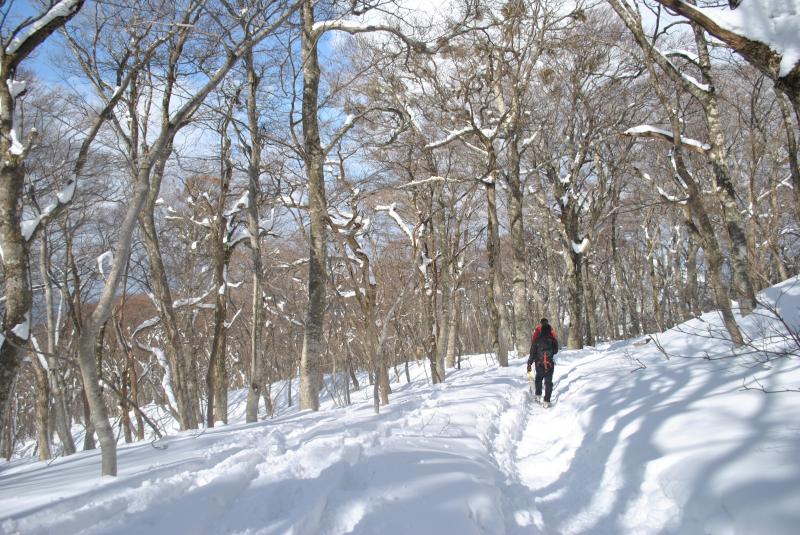 - 六合目の小屋まではブナ林の中を歩き、六合目以降は雪に刺したピンを道標に登っていきます。