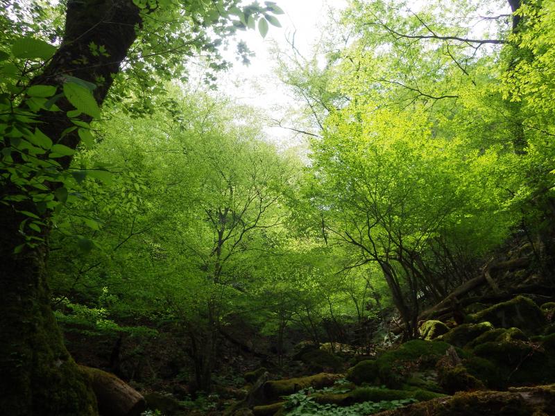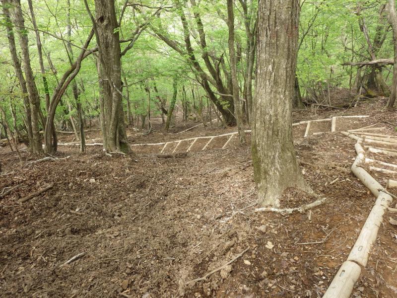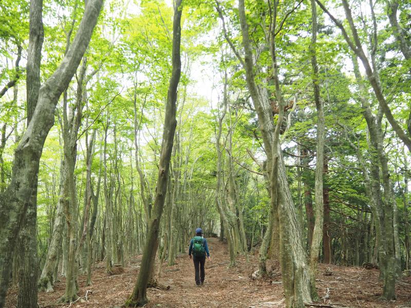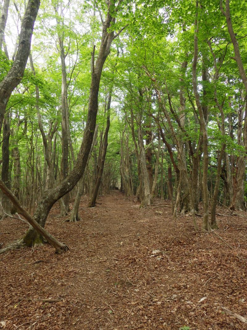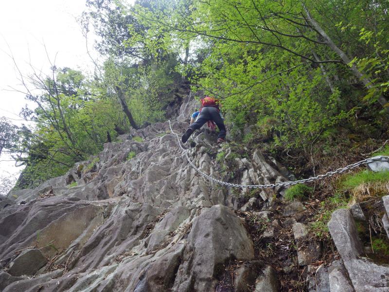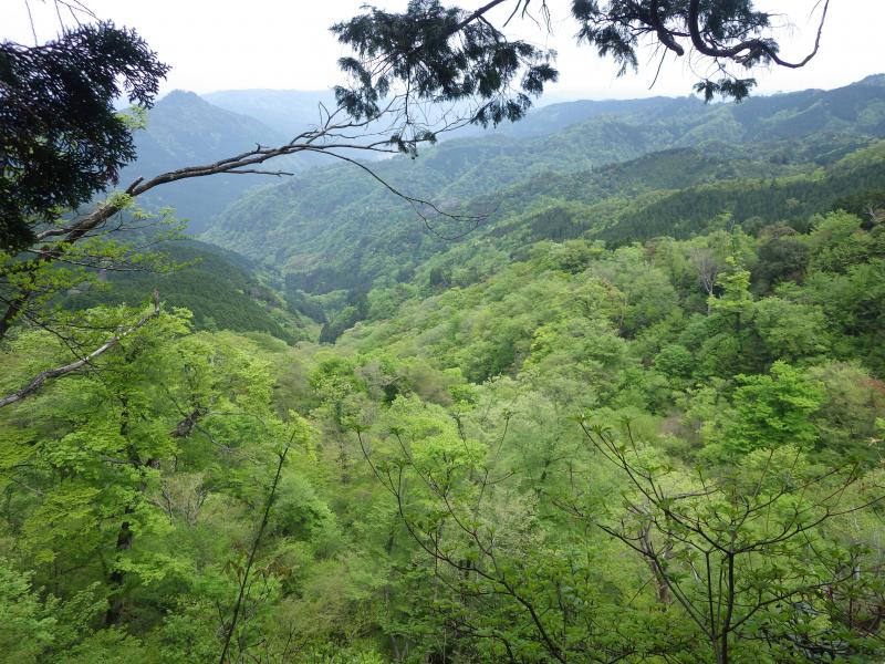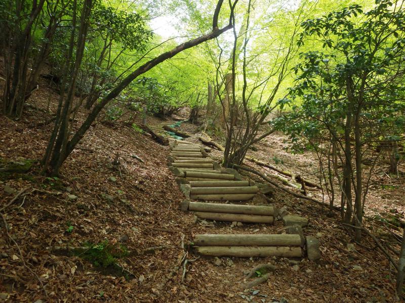 ウグイス谷コースからスタート。林道出合までは緩やかな登りです。今日は青空が広がっていて新緑の緑がとってもきれいです。林道出合から右へ折れてしばらく林道を歩くとベンチ発見。ここからまた登りが始まります。だんだんと急な登りしかも私の苦手な階段が続き息が少し上がってきます。この辺りもとても迫力ある新緑で何度も立ち止まって空を見上げ溜息。きれい、、、そろそろ稜線に着こうかというころ、ちらほらとシャクナゲが見え始めました。ほどなく稜線に到着。笈吊峠にはこれから進む登山道の案内があります。そう、この先に困難な鎖場があるそう。鎖場1、鎖場2、迂回ルート。もちろん鎖場1に挑戦。下から見上げるとまあなんとか行けるでしょう、と思っていたのですが実際登り始めると、、、ん?次はどこに足を置けばいいんだ?とちょっとパニック。下を見るとドキドキ(汗)慎重に三点支持を守って登ります。登り切った場所からの眺めは最高でした(笑)