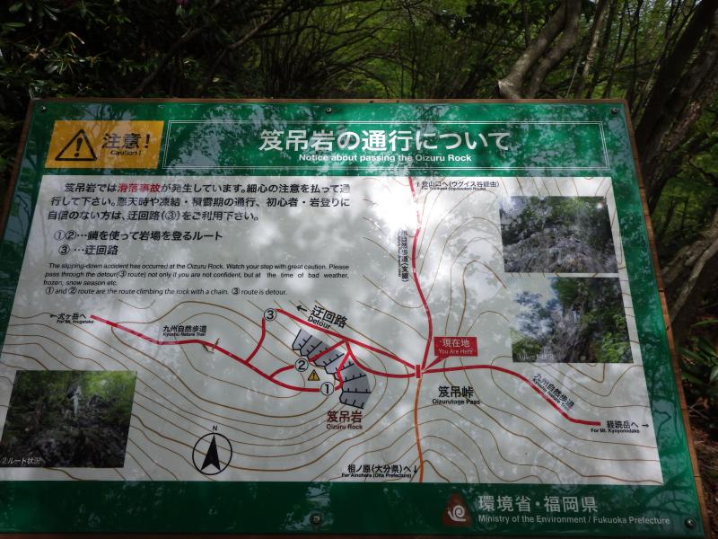 - 登山口<40分>林道出合<30分>笈吊峠<80分>犬が岳山頂<30分>一の岳<85分>求菩提山山頂<100分 迷ってます>登山口