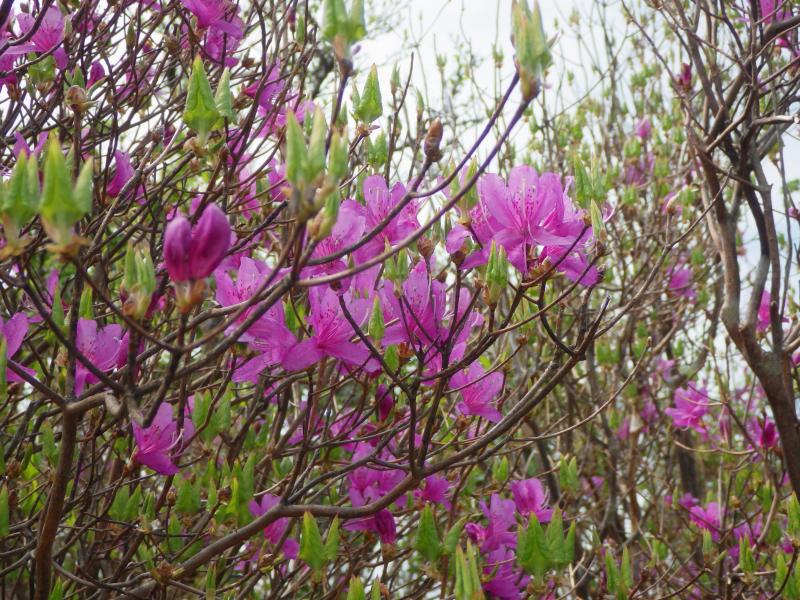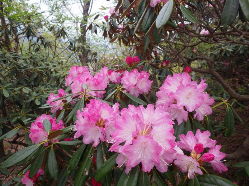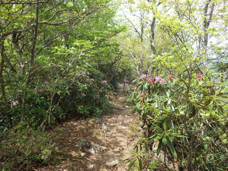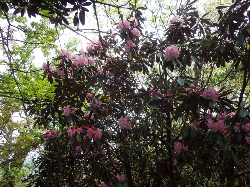 さぁ、シャクナゲが咲く稜線歩きのスタートです。今日の開花状況は五分咲きぐらい?でしょうか。沢山咲いている株もあれば、今にも咲きそうな鮮やかなピンクの蕾をこれでもかと抱えている株、まだまだ蕾の固い株。どこまでもどこまでもシャクナゲロードが続きます。写真を撮ってばかりいるのでなかなか前に進みません(笑)ようやく山頂直下の広場に到着。山頂は展望がないということでここで休憩している人たちがたくさんいました。もちろんベンチもあり。私たちは先に進みます。ひと登りすると山頂に到着!!確かに展望はほとんどなし。記念撮影をしてそそくさと山頂を後にしました。