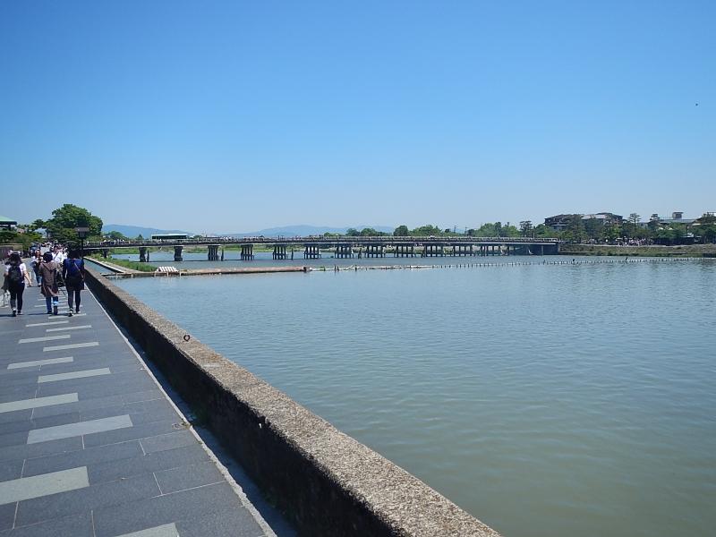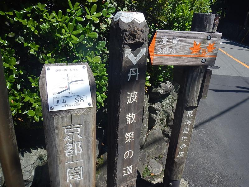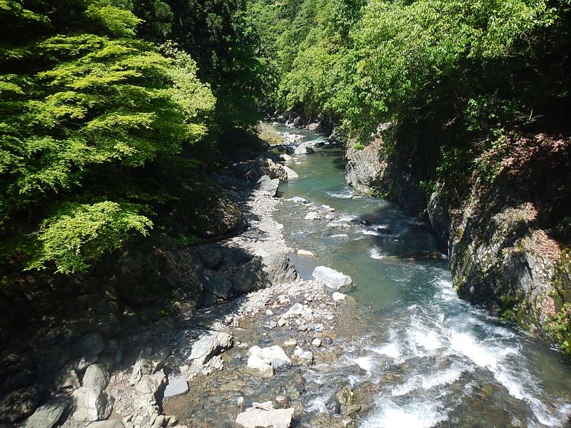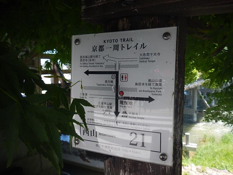 清滝川沿いを川の音を聞きながらゆったりと下っていきます。愛宕山に寄り道も考えましたが、今回はぐっとガマンして京都トレイルの道標通りに進みます。保津川との合流地点は峠道の車道を通るので暑くてばててしまいそう。川は前日の雨で濁っていました。残念・・