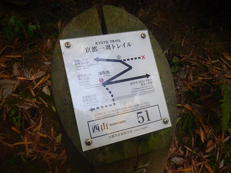 - 京都駅=(バス50分)=槙ノ尾バス停―(60分)-清滝―(90分)-嵐山―(90分)-烏ヶ岳―(30分)-松尾山―(25分)-西山51番―(25分)-阪急上桂駅