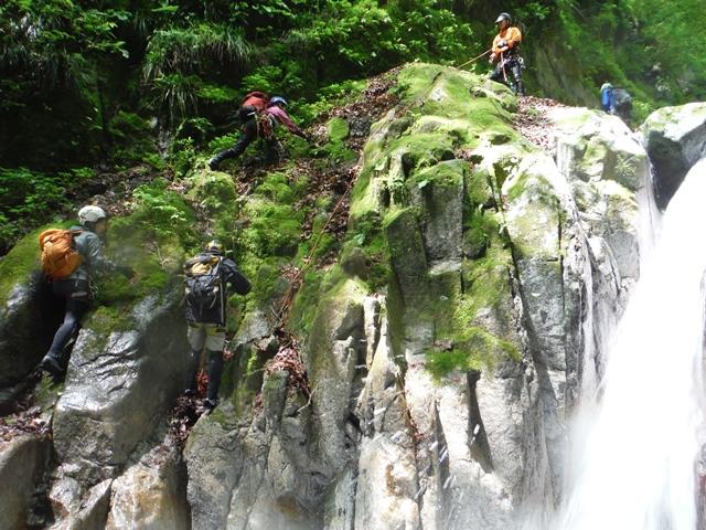F3 6mはやや手前を右から。2段2mx5mは上段水量が多く滝左から迂回。