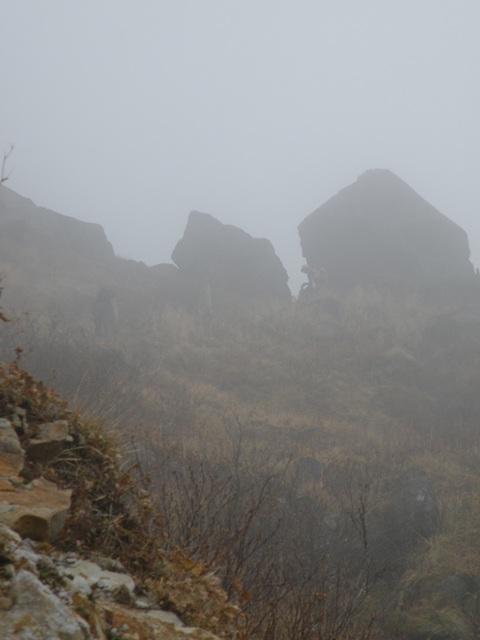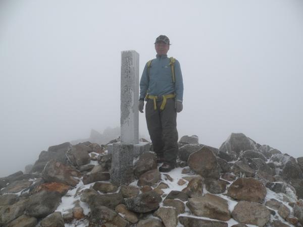 室堂でジャケットとレインウエアの下を着るが、寒い。温度計は零度以下。風もあるのでますます寒い。もう1枚着ようかなと思ったが、手袋と帽子を被って白山に向かう。ガスでさらに視界が悪くなり、近くの視界もない。