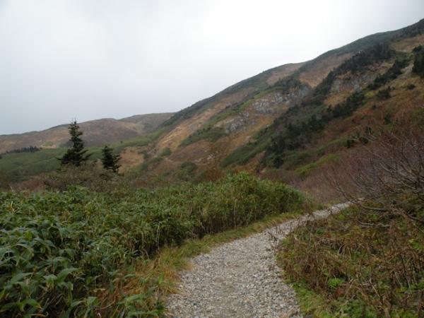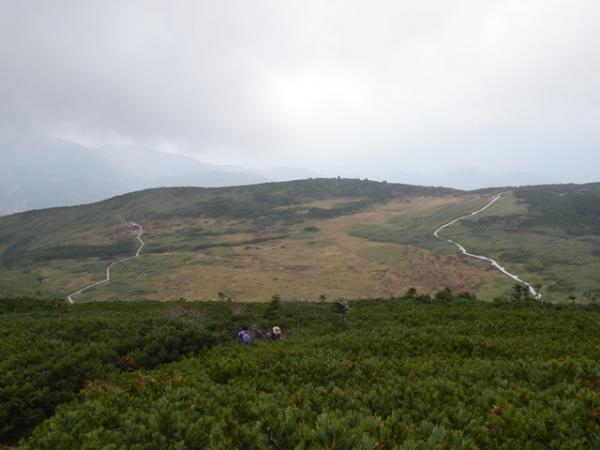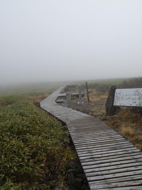 最初は、晴れていたが避難小屋に着いた辺りから曇ってきた。黒ボコ岩への登り辺りでは、ガスで視界が、やや悪くなる。弥陀ヶ原はガスで遠くの視界がなく、白山は全く見えない。
