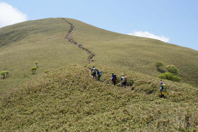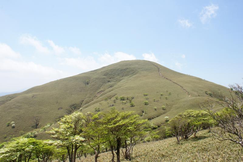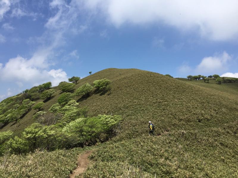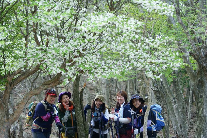 開放感たっぷりの笹原の尾根筋に出ると、点在するシロヤシオの木にテンションも上がります。