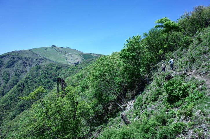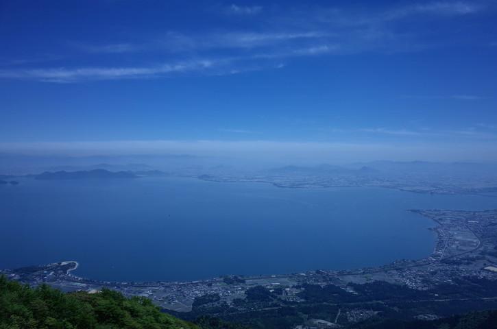 急な斜面につくられたジグザグの登山道を新緑を楽しみながら登っていきます。尾根にでると琵琶湖が一望でき涼しい風とあわせて登りの疲れを癒してくれました。