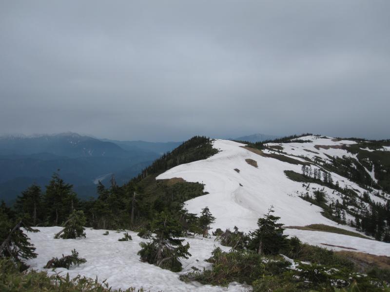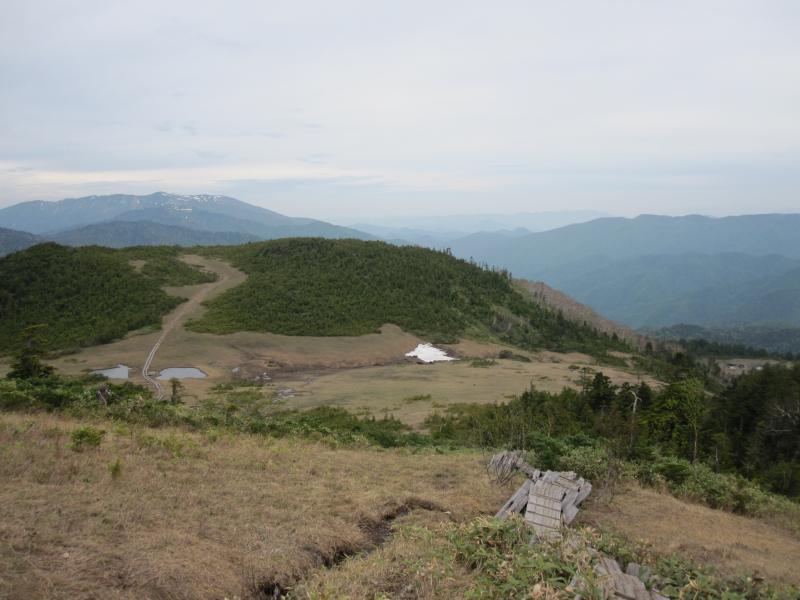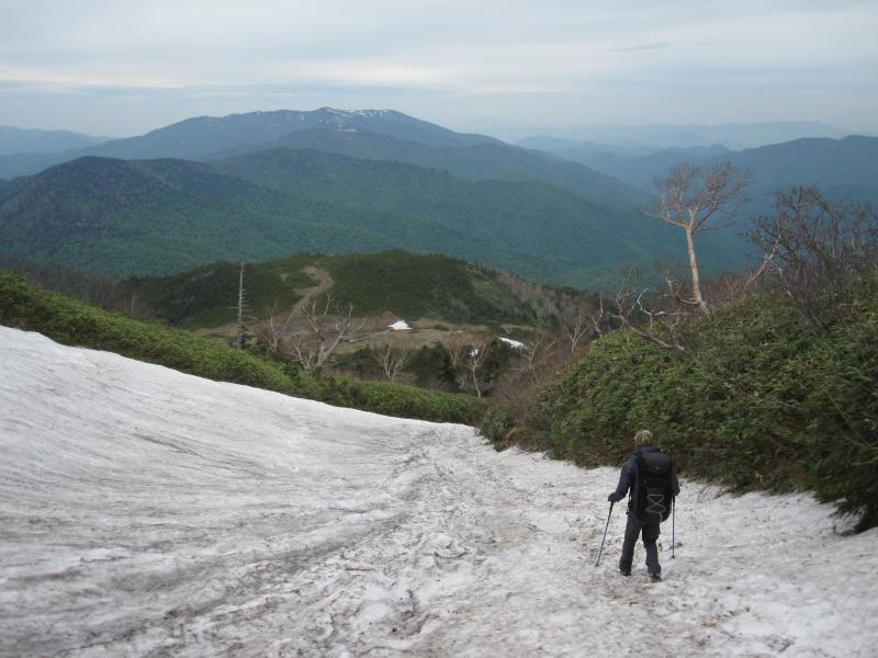 御池方面へ下ります。何度も雪渓をトラバースしますが、こちらはアイゼン無しで通過しました。迷いやすい箇所や歩きにくい箇所もあるので、残雪の多い時は特に注意が必要なコースです。池塘や湿原が本当に素晴らしい熊沢田代や広沢田代があり、秘境の雰囲気があります。すれ違った人は1人のみ。ぐるっと景色を独占したような気分が味わえました。感動!