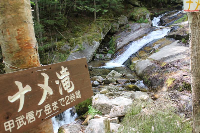- 毛木平駐車場<100分>ナメ滝<135分>甲武信ヶ岳山頂<200分>十文字小屋<90分>毛木平駐車場