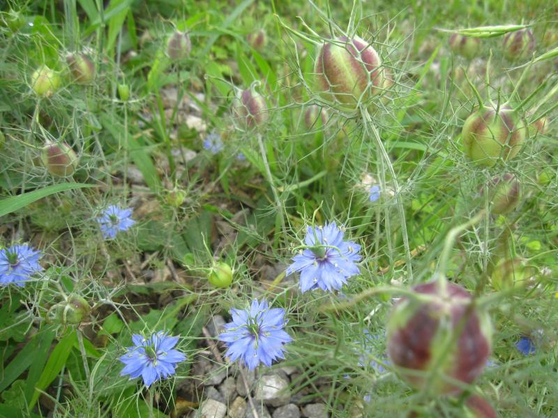 その内の1軒の駐車場に、淡いブルーのお花を発見。奥に鴨池の水蓮が重なり、モネの絵画のようでした。