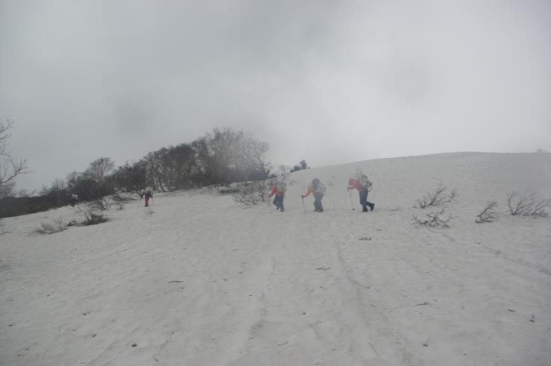 - 5合目まではロープウエイを利用。5合目からも残雪が登山道を覆い、7合目のリフト駅からはほぼ雪渓歩き。傾斜がきつい箇所もあるので慎重にキックステップで登りましょう。朝晩や雪面が堅い時は軽アイゼンが必要です。