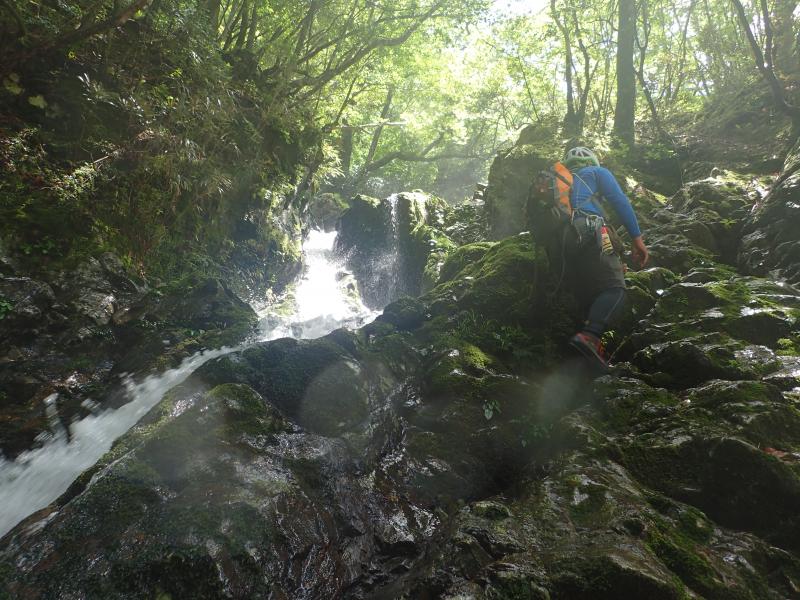 前鬼川は、苔のついた岩のほうが多くビブラムソールの靴だと足元が滑るので、かなりこわい思いをしました。