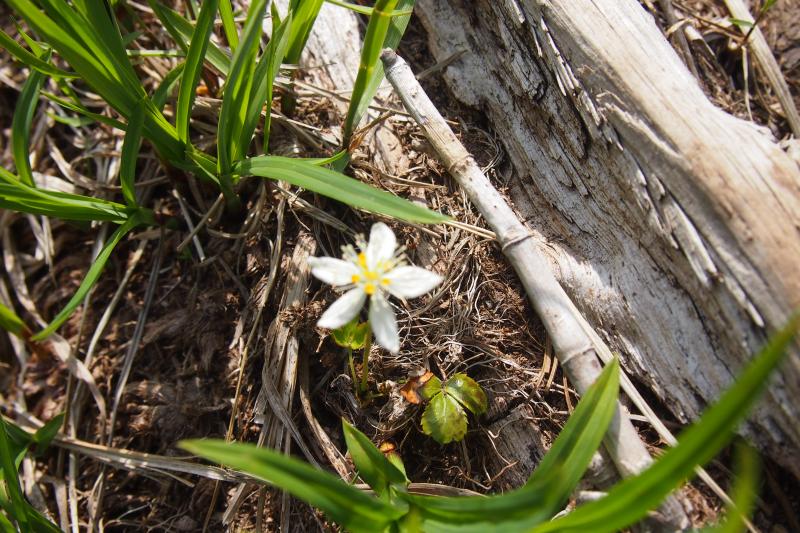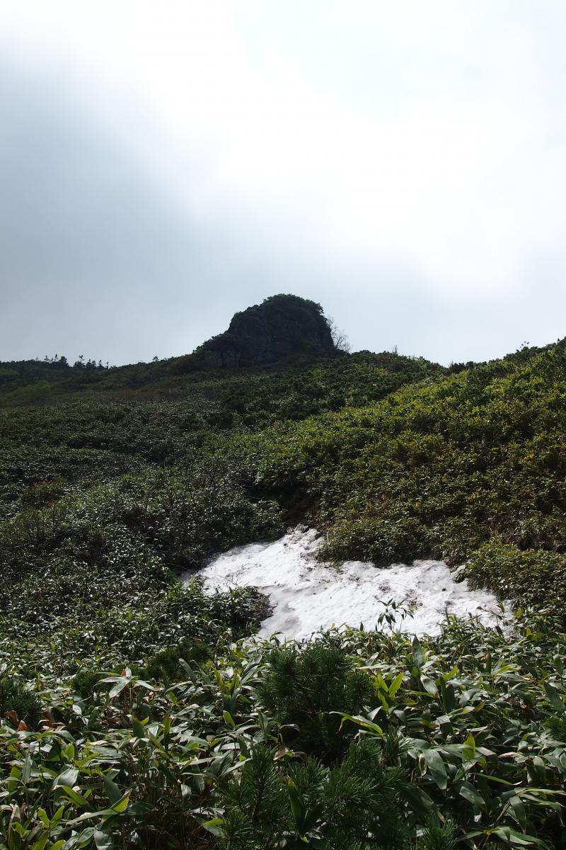 笹清水分岐前に雪渓あるが、アイゼンは不要。昼間はゆるくなるので、落ちないように注意。