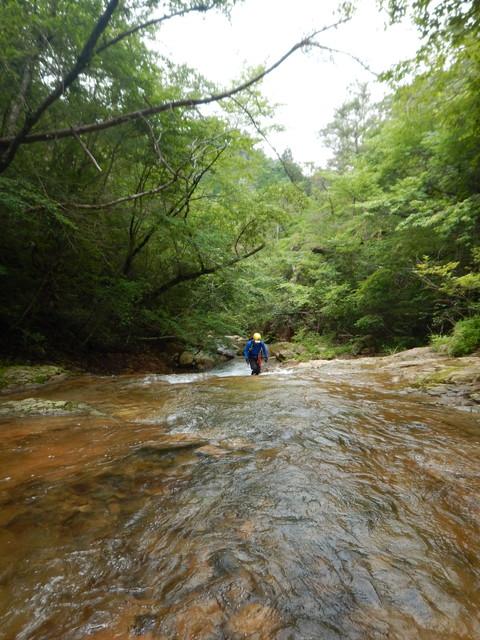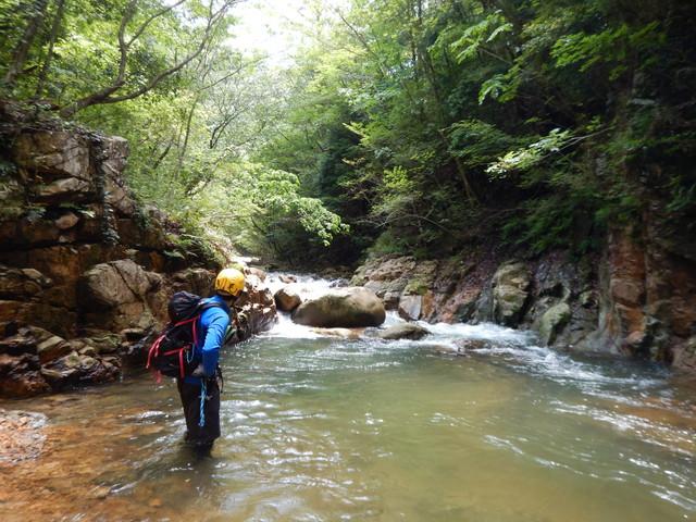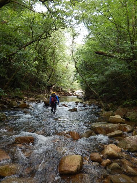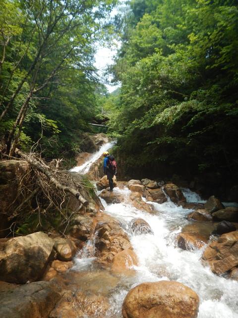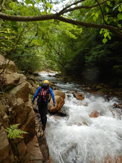 序盤は緩やかな渓相の中、沢歩きが楽しめます。出てくる小滝は増水していたため巻き気味に登りました。