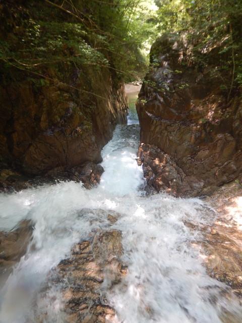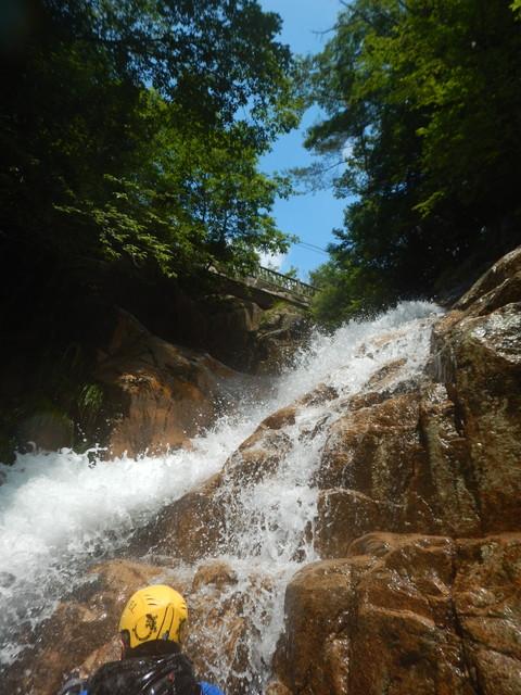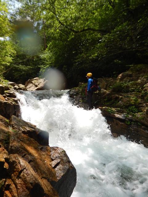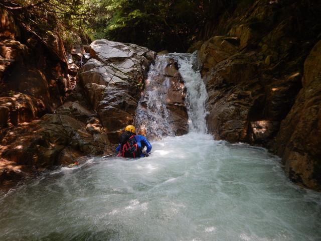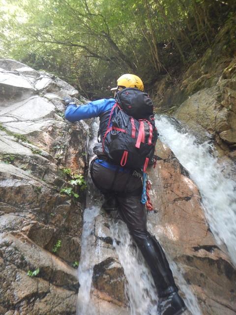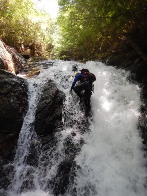 後半のゴルジュは泳ぎで側壁に取り付き登ろうとしましたがスタンスの少なく苦戦‥お助け紐を出してもらいました。その後の二つの滝は比較的優しく登りが楽しめました。