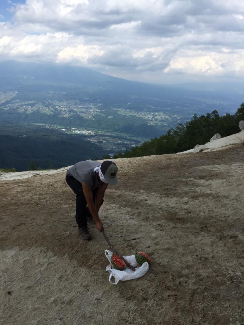 食事も終えて今回のメインイベントであるスイカ割り、1発でスイカがパカーン。甘くて瑞々しく水分補給にピッタリ。下山後に尾白川によって河原でイスとテーブル並べて、忘れていた甲州牛を焼いて食べて川で遊んで楽しかった1日でした。こんな遊びをまた出来たらと思います。