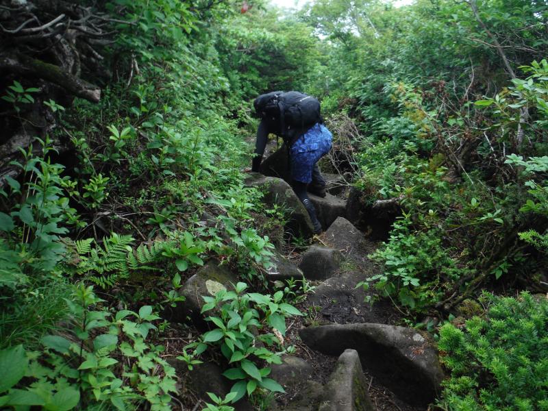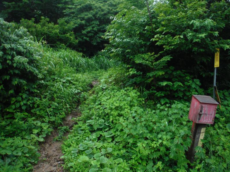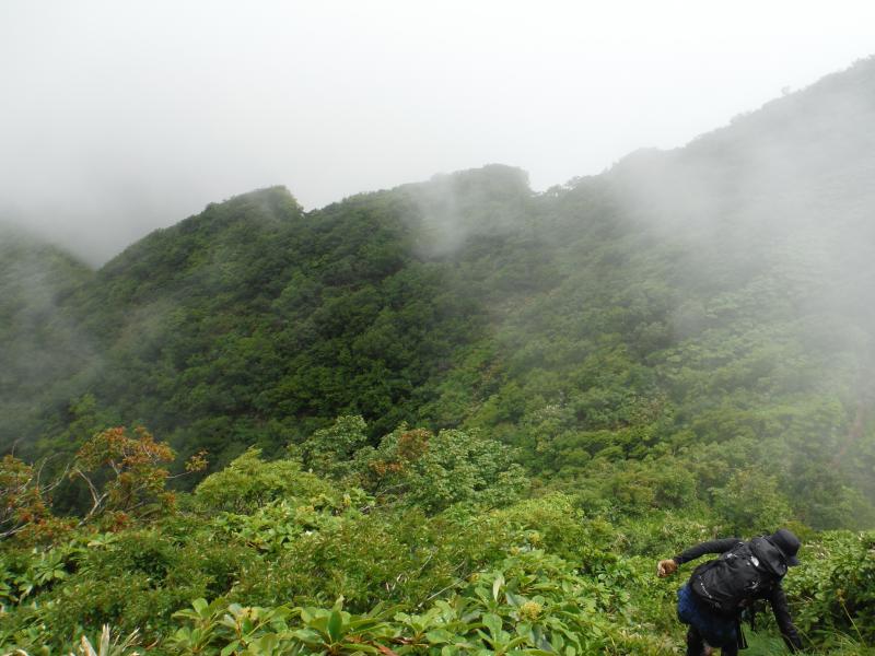 田子倉湖が近いため、雨の日の早朝は霧に覆われていることが多くこの日も登り出しは霧雨でしたが、晴れることを信じて登り始めました。