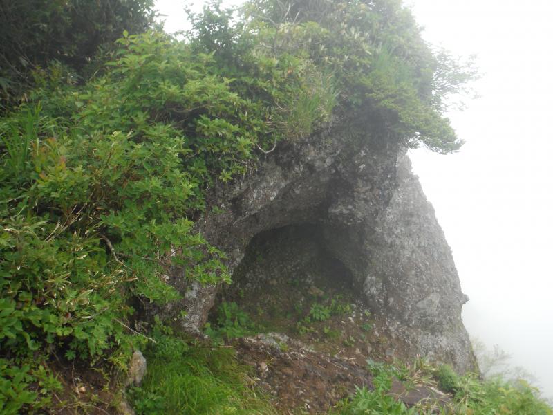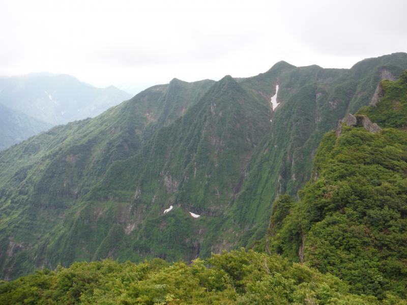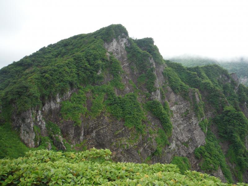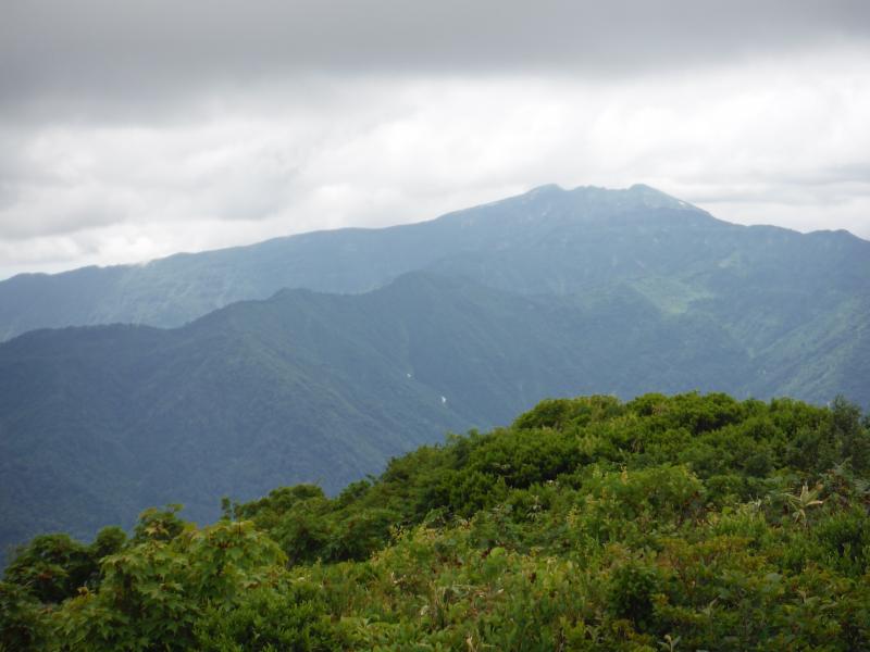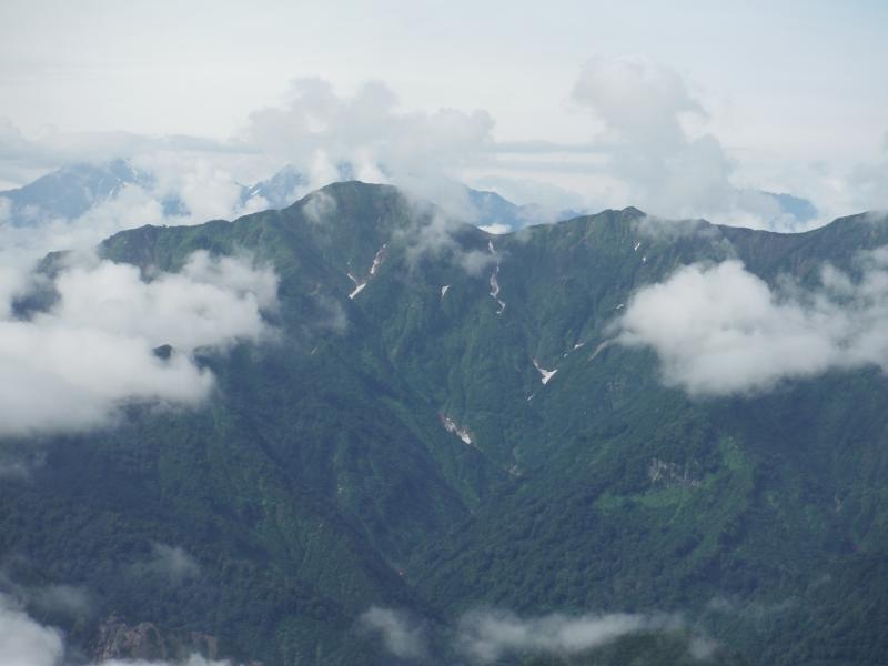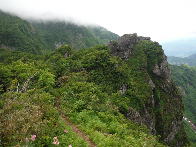 雲が動き始めたのは森林限界を抜け出し南岳に着いた頃。背中側の毛猛山塊の後ろに微かに越後三山が確認できました。行く手の切り立った鬼ヶ面の山肌も時折見え隠れしましたが、全貌は相変わらずガスの中。その代わりに、ヒメサユリやゴゼンタチバナが道を彩り、アップダウンに喘ぎながらも登り続けてようやく山頂へ。