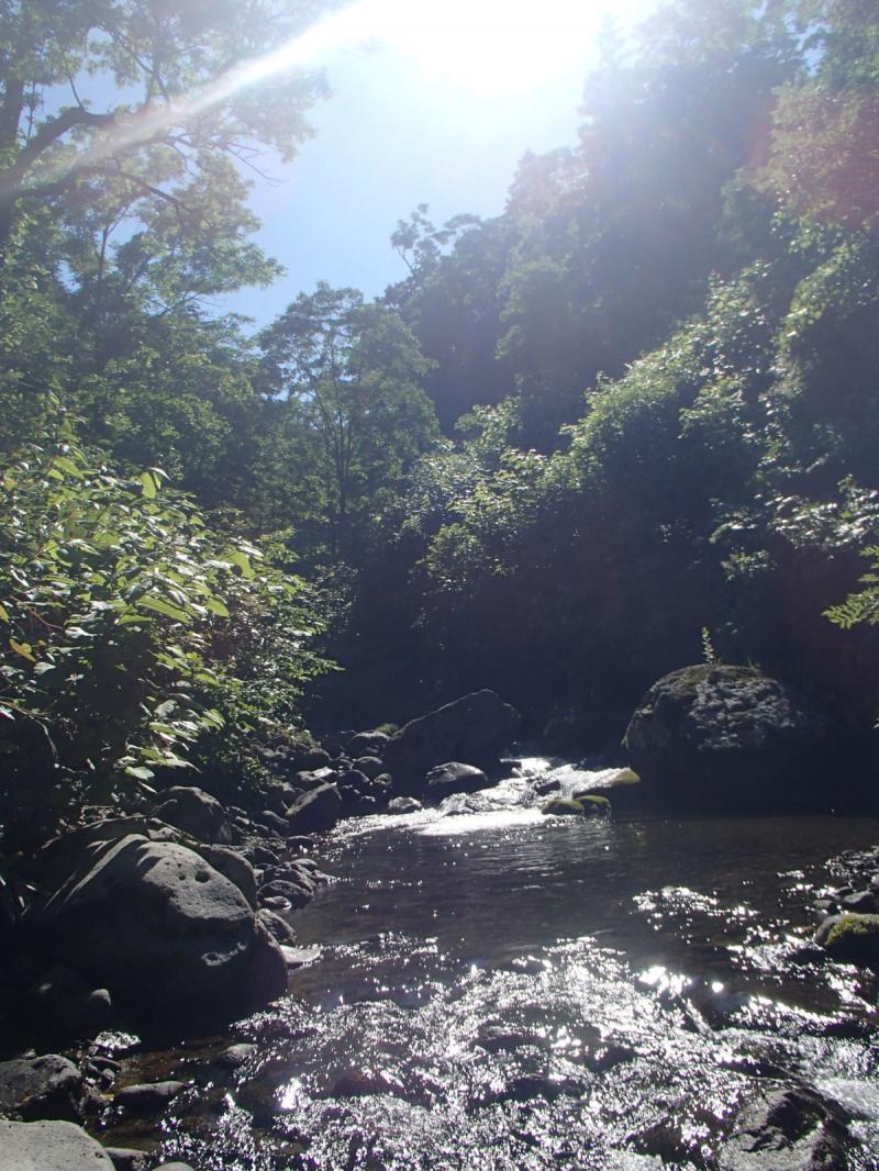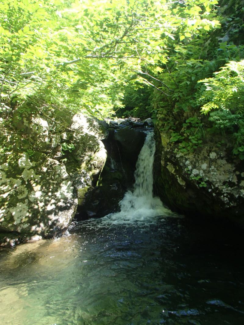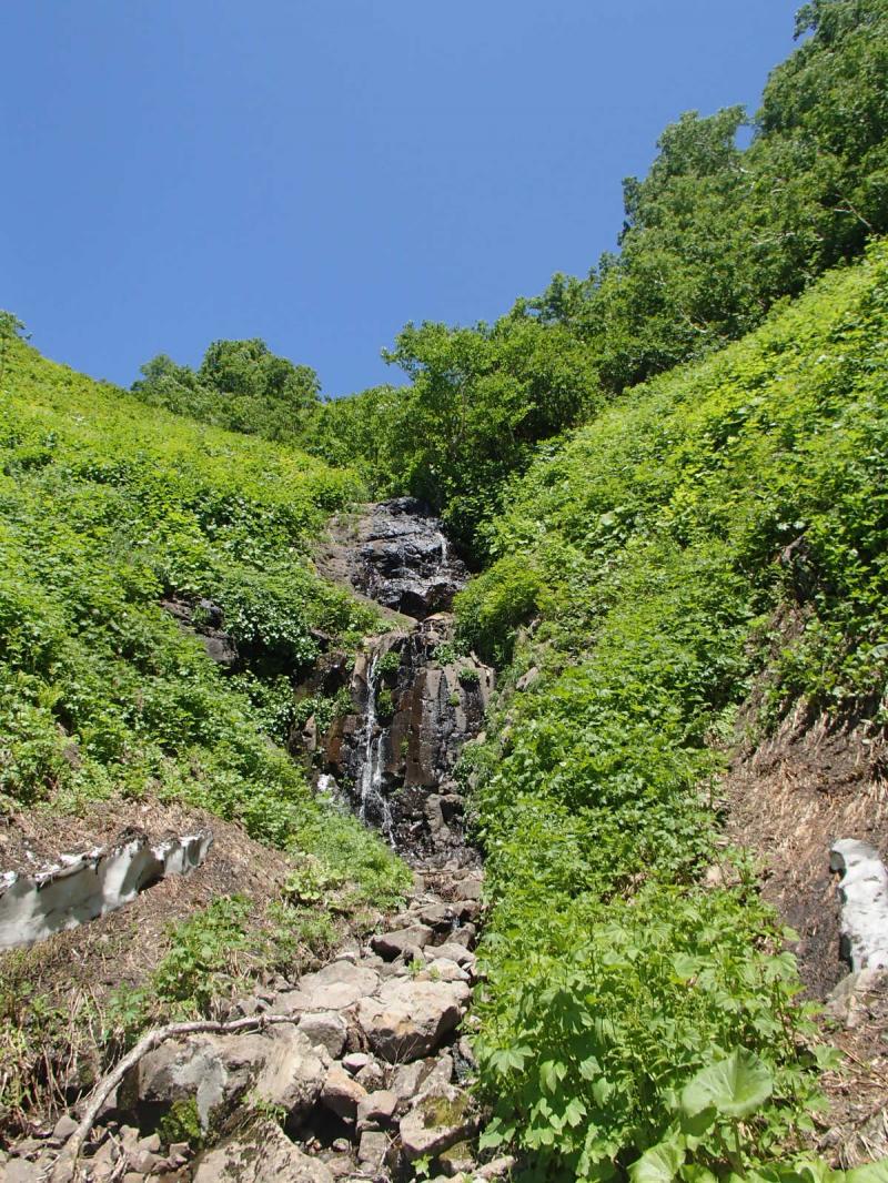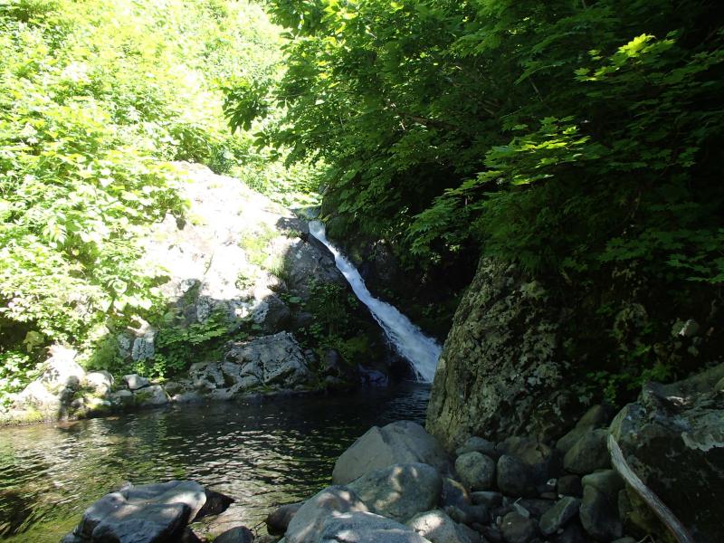 大きな滝はなく、大半は平凡なゴーロ。370m二股からは滝がいくつか出てくるがいずれも小さく傾斜もない。次第に水量が減っていくが800m付近で突然2段15m滝が突然出てくる。稜線まではさほど藪こぎはないものの稜線から頂上までは1時間たっぷりと笹薮とハイマツを漕ぐ必要があり。沢になれたパーティならロープは使わないと思いますが、下りで懸垂する可能性もありますので30m位のロープは必携。