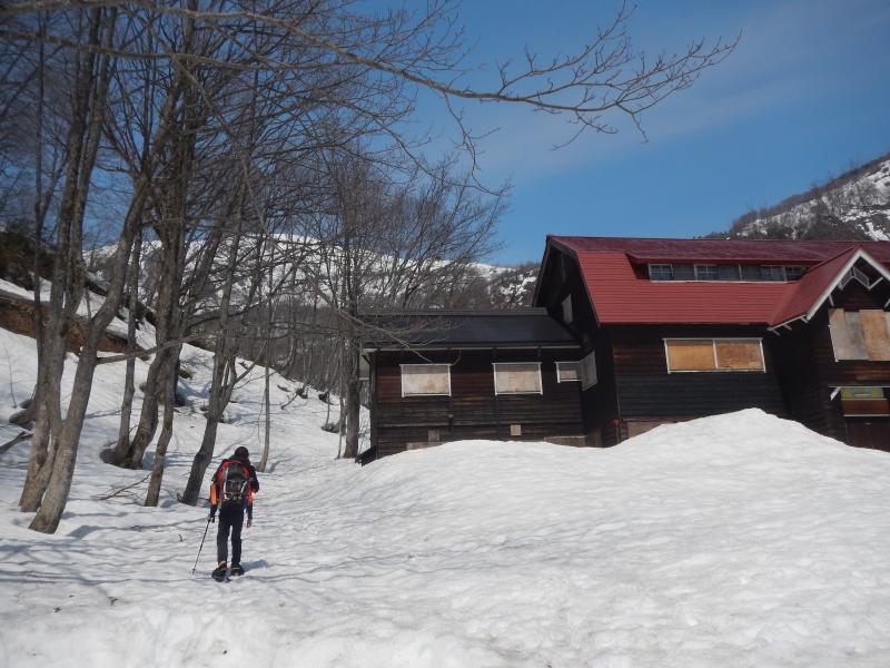11:00 猿倉荘着。ここまでは除雪済み。そこからワカン/スノーシューを装着し、残りの半分のアプローチを歩く。