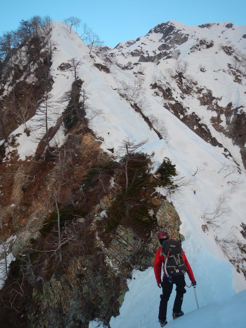14:00 ルート偵察。明日のアタックは明朝スタート。八峰までは幅広い雪面を歩く為、暗闇でルート取りを誤らない様に入念に下見を行う。