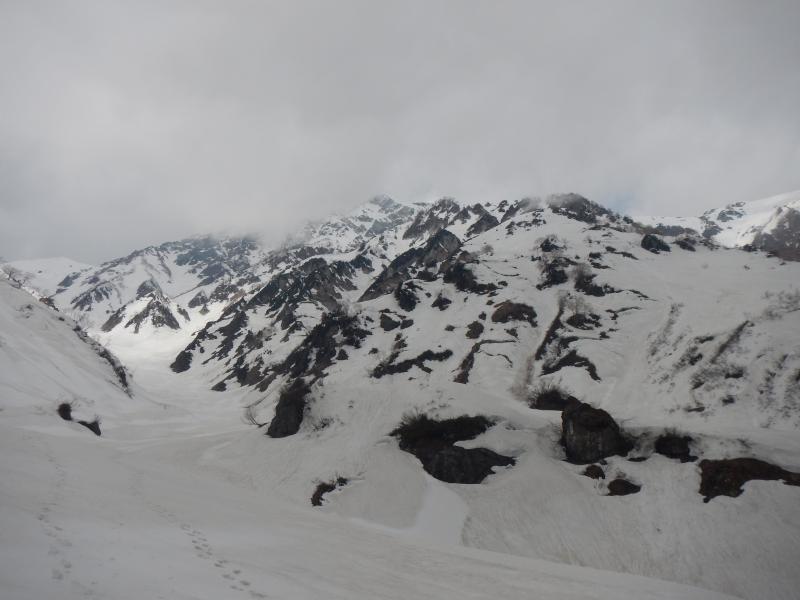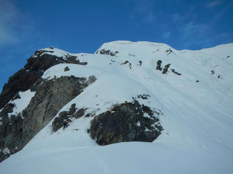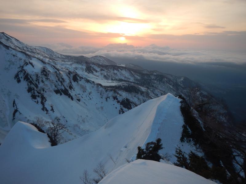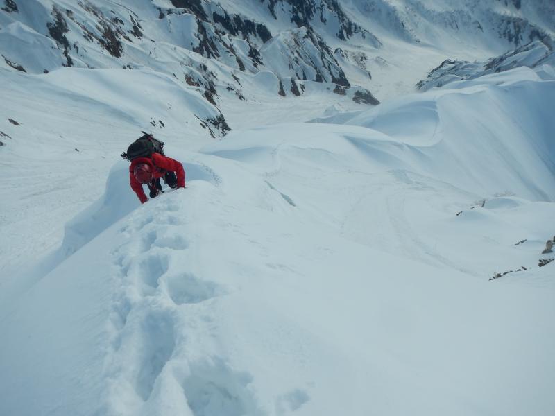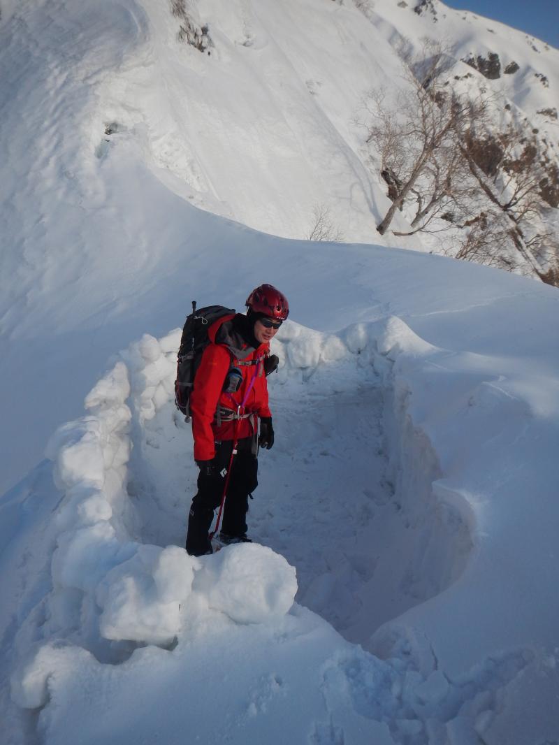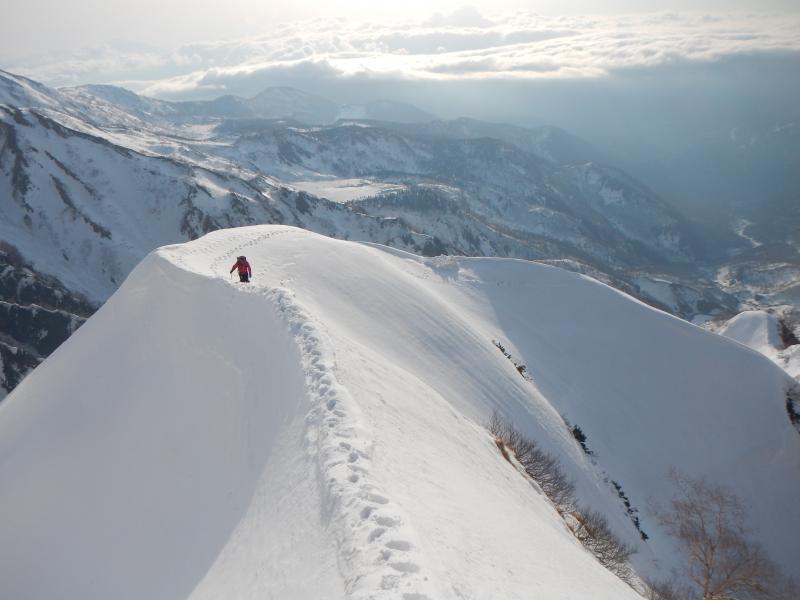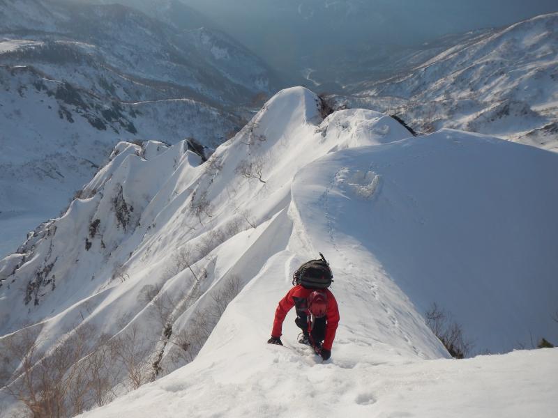 - 例年より遥かに少ない積雪量のため猿倉までの道路に雪は無く、七峰辺りまでの雪稜や雪面には亀裂が入っている箇所も。当日は、前日までの季節外れの降雪により根雪の上に10㎝程の表雪があり、隠れた亀裂などに注意して歩くこともしばしば。核心である頂上直下の雪庇はそこまで張っておらず、ロープなしで何とか抜けることが出来ました。