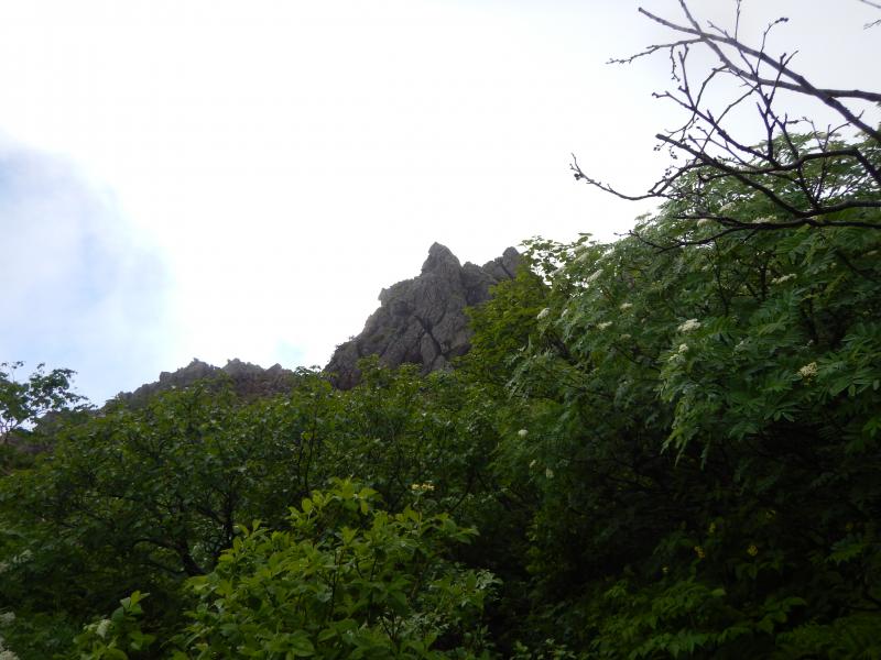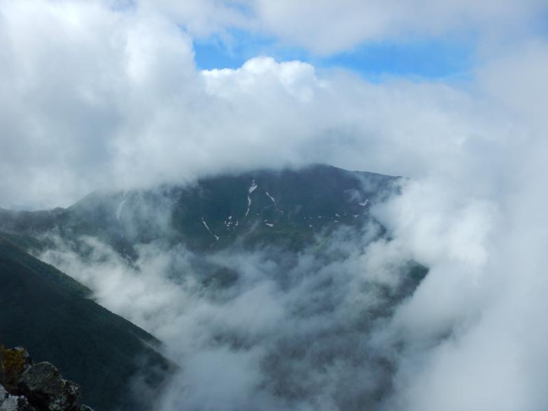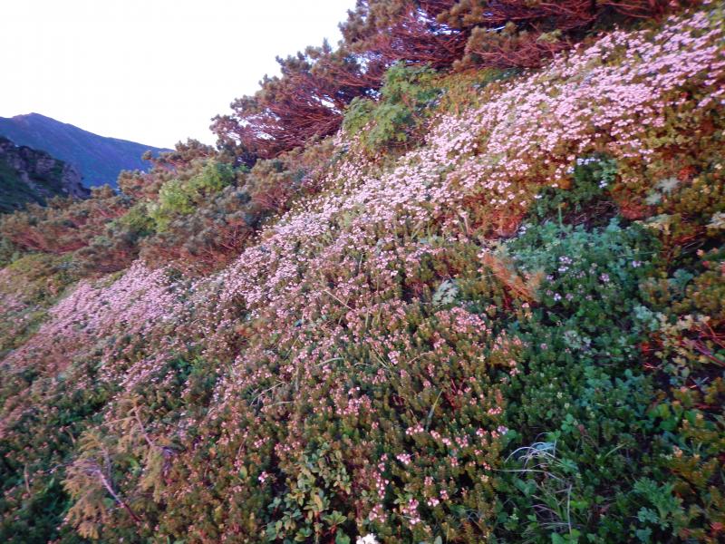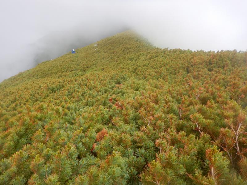 コースの約7割くらいがハイマツ漕ぎという過酷な道でした。足元だけでなく胸や頭まで被る箇所も多いです。また途中から雨が降り始めたので、漕いでるときはまるでシャワーを浴びているよう。朝・雨天時はハードシェル必携です。