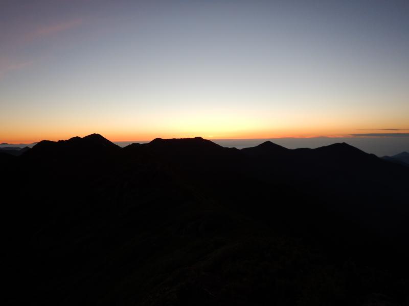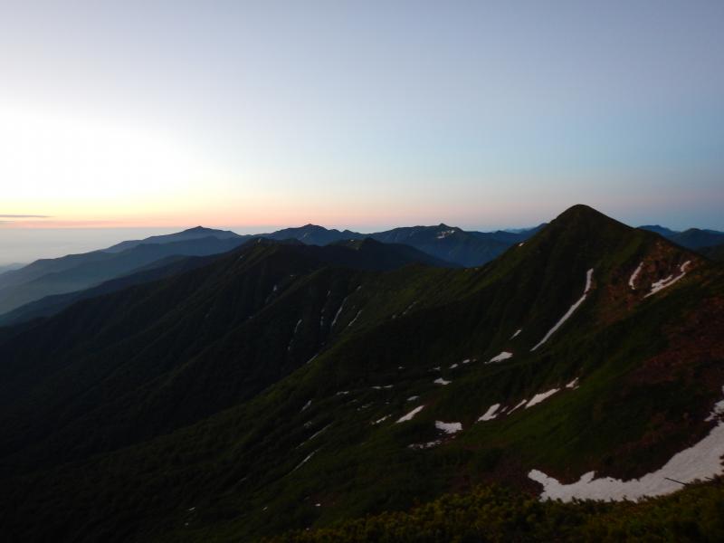 1日目、午後から雨が降ってきたために装備が全部濡れてしまい翌日のプランを変更して下山を考えましたが、翌朝の満天の星空を見た瞬間、2日目の旅の続行を決断。北海道の中心がすべて一望、日高山脈の山々の名前を覚えていないことを悔やむくらいすべてが望めました。