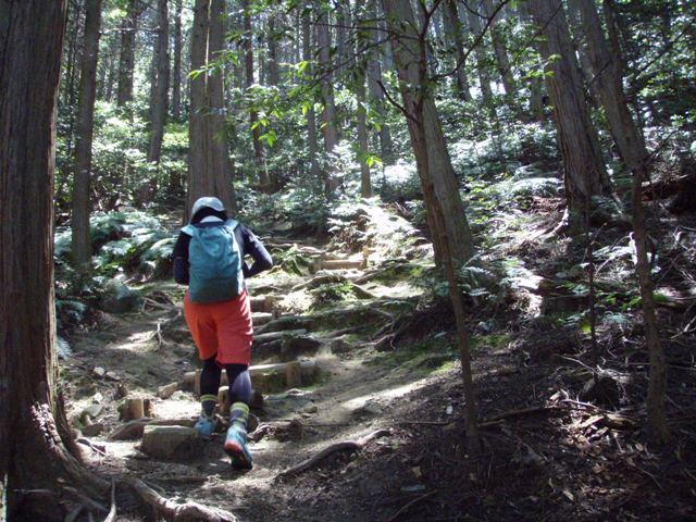 御上神社・駐車場から出発。住宅脇から裏道の登山口へ。よく整備された登山道を登り、十字路の分岐からまずは女山へ。標識、展望何もなし。気温28度。