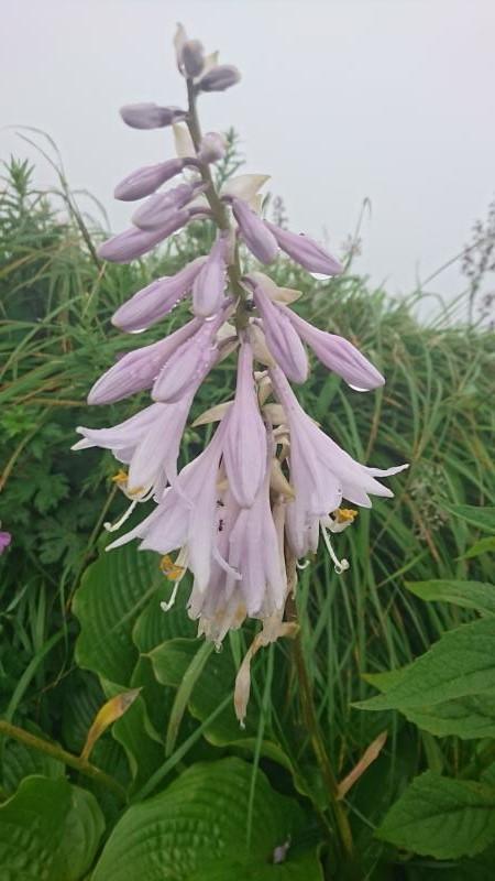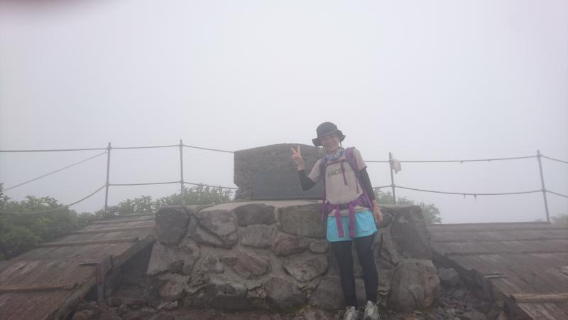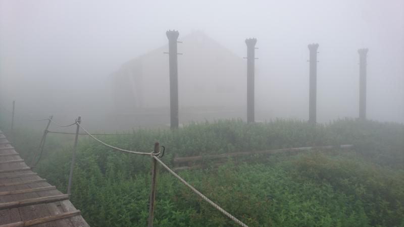 6合目からは、行きはガスで何も見えないままぼんやりと避難小屋が現れ、以前が快晴だったのでその記憶を頼りに遊歩道を散策。