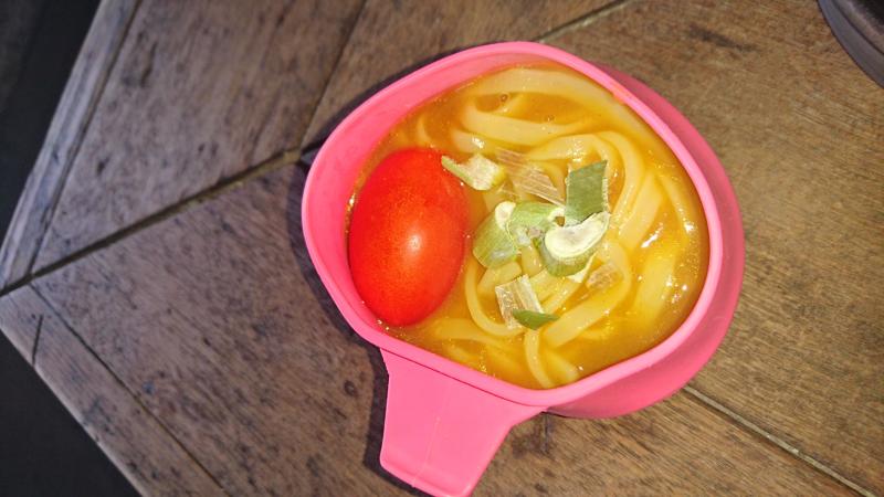 私は持ってきた岳食のカレーうどん。初めて食べましたが美味しかったです。野菜類をプラスすればなおGoodですねー。あいにくミニトマトにか持ち合わせていませんでしたが、無理くり投入(笑)