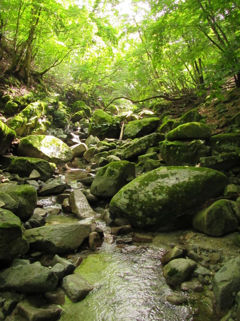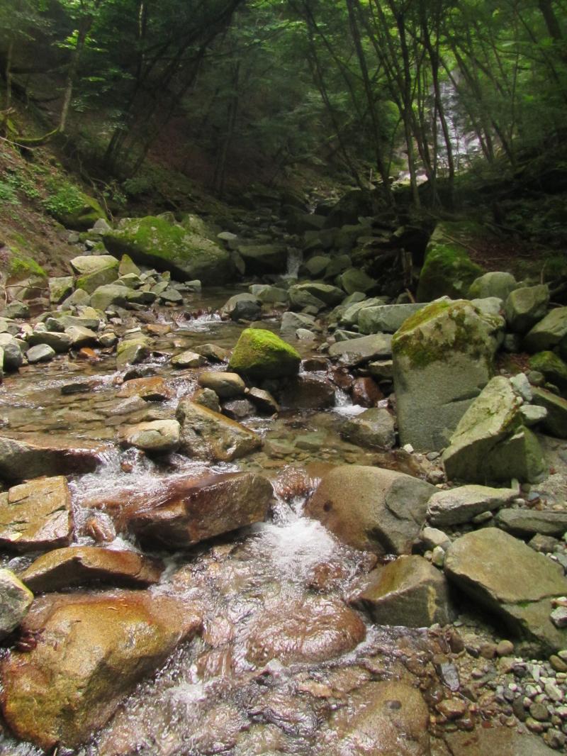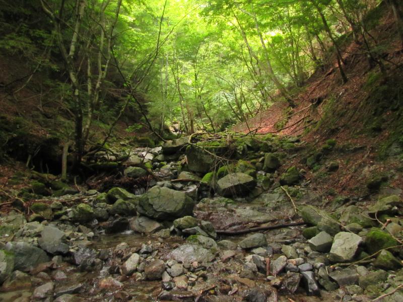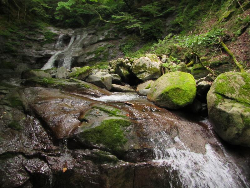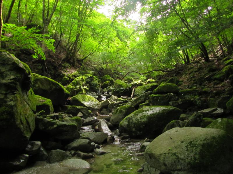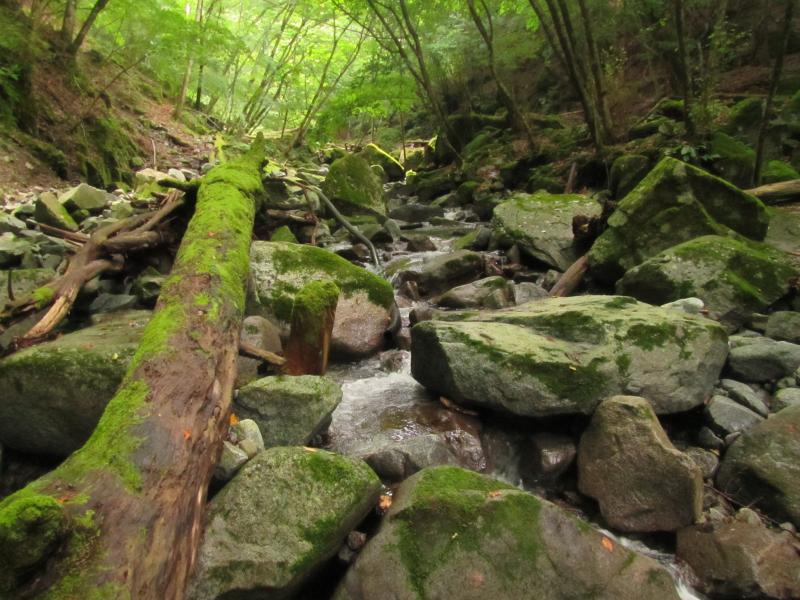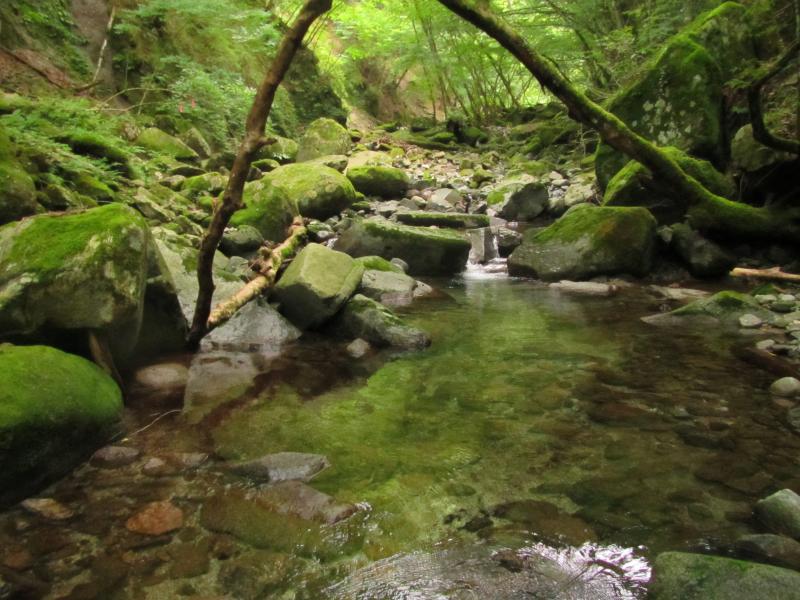 畦ヶ丸北面の原生林から湧き出す豊富な流れのなかに、美しい釜やナメと、苔むしたゴーロが光彩を放つ西丹沢を代表する癒し系の沢として知られます。