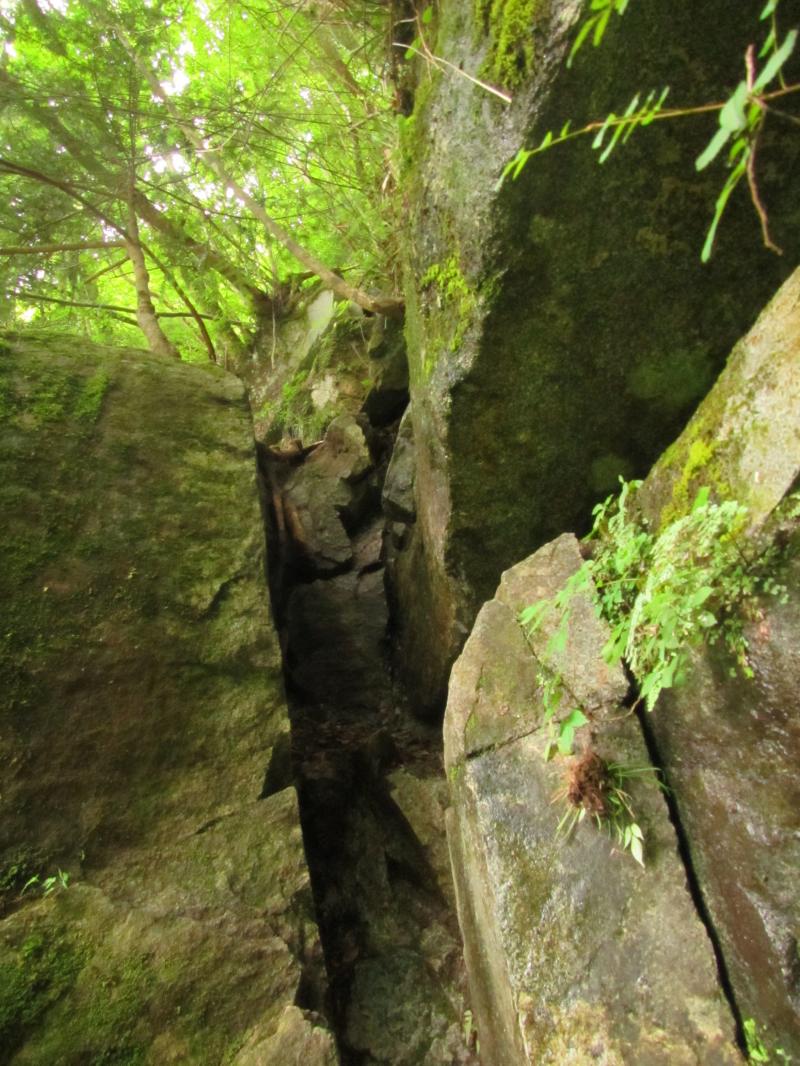 直登は人工登攀となるものの、右岸高巻きは分かりやすく、岩の隙間を腕力で攀じ登ります。